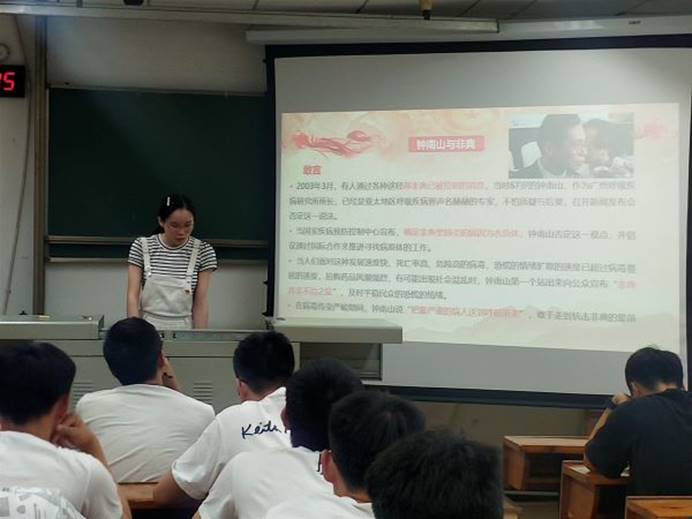 接着,吴志琴同志分享了“抗击非典领头人”钟南山院士的事迹,他是学者、专家、英雄也是医生,他是患者的守护神与精神支柱。他也曾因疲劳过度病倒,但并没将生病的消息告诉他人,以防影响到病人情绪引起恐慌。钟南山院士一路不断否定,一生不断前行。在2019年的新冠疫情中,84岁的钟南山再一次不顾个人安危挤上高铁前往最严重的武汉调查研究,他带领着更多年轻的同行火线入党,引导着更多优秀的年轻人步入医学岗位。