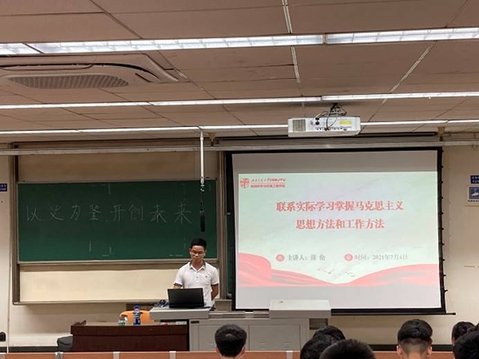 本次主题党日活动由机械硕士第一、二、三党支部联合进行宣讲,邀请了蒲伦博士作为宣讲人。蒲伦以“联系实际学习掌握马克思主义思想方法和工作方法”为主题,以习近平总书记在庆祝中国共产党成立100周年大会上的讲话为引,从“坚持实事求是、坚持战略定力、坚持问题导向、坚持全面协调、坚持底线思维、坚持调查研究、坚持抓铁有痕、坚持历史担当”八个方面为大家进行了详细阐述。蒲伦强调,习近平新时代中国特色社会主义思想是坚持和运用辩证唯物主义和历史唯物主义的光辉典范,蕴含着丰富的马克思主义思想方法和工作方法,既是世界观、历史观,也是认识论、方法论;既讲是什么、怎么看,又讲怎么办、怎么干;既部署“过河”的任务,又指导解决“桥或船”的问题,为推进党和国家事业发展提供了锐利思想武器,学习掌握这一思想,既要全面准确领会其中的丰富内涵、思想体系和实践要求,又要深刻把握贯穿其中的科学思想方法和工作方法,不断提高攻坚克难、化解矛盾、驾驭复杂局面的能力,在新时代更好地坚持和发展中国特色社会主义。
