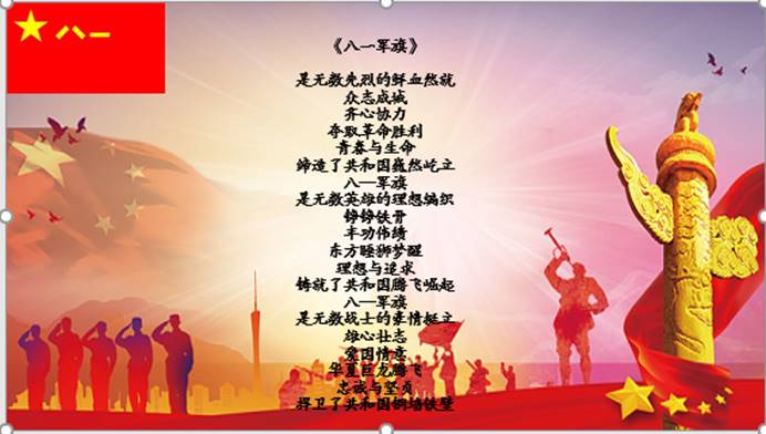 本次活动围绕建军节展开,首先李俊同志向大家介绍了建军节的来历,在1933年的7月11日,中华苏维埃共和国临时中央政府将8月1日作为中国工农红军成立的纪念日,1949年6月15日确定了“八一军旗”和“八一军徽”,在1949年的8月1日是新中国的第一个真正意义的建军节。