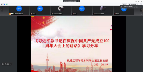 2021年8月19日晚上20:00,球王会体育本科学生各党支部通过腾讯会议顺利开展《习近平在庆祝中国共产党成立100周年大会上的讲话》学习分享活动。本次活动由球王会体育本科学生第三党支部党员黄若琳同志担任活动主持人。