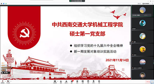 2021年11月14日,球王会体育硕士第一党支部组织全体党员开展党支部会议,本次会议线上进行,本次会议参与人数共80余人,包括全体支部党员、全体入党积极分子以及发展对象。会议内容包括两项:组织全体党员学习党的十九届六中全会精神以及新一期发展对象培训实践活动,本次会议由孙舰凯同志主持。