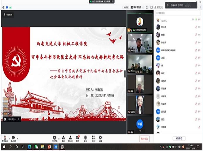 研究生之窗讯(记者 樊翔翔 报道 卢旭磊 摄影)11月18日下午19时,机械学院硕士第四党支部组织全体党员在线上以视频会议的形式开展十九届六中全会公报学习会。此次学习会是为了深入学习贯彻党的十九届六中全会精神,回顾党的百年奋斗历程,激励党员同志们传承伟大建党精神,矢志民族复兴的伟大事业。本次学习会由党支部书记张有旭同志组织开展。