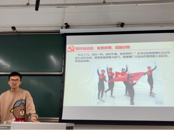接着,孙嘉祺同志带领支部同志学习了习近平总书记给中国冰雪健儿的回信。2月24日,习近平总书记给中国单板滑雪运动员苏翊鸣回信,向他和中国冰雪健儿取得优异成绩表示祝贺,并提出殷切期望。“养兵千日,用兵一时。此时不搏,更待何时!”总书记的殷殷嘱托是冰雪健儿勇往直前、创造奇迹的强大底气,鼓舞着广大运动员继续踏上新征程、攀登新高峰。总书记在回信中深情寄语青少年,“希望你们心系祖国,志存高远,脚踏实地,在奋斗中创造精彩人生,为祖国和人民贡献青春和力量。” 未来属于青年,希望寄予青年。总书记鲜明指出,“我国青年不懈追求的美好梦想,始终与振兴中华的历史进程紧密相联。”“这是‘长江后浪推前浪’的历史规律,也是‘一代更比一代强’的青春责任。”作为新时代中国青年,我们应当奋勇拼搏,不断突破,不负时代,不负韶华,不负党和人民的殷切期望。