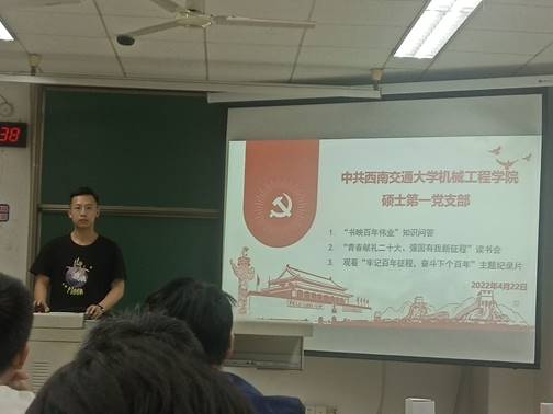 2022年4月22日,球王会体育硕士第一党支部在逸夫馆4404B开展“青春献礼二十大,强国有我新征程”主题党日活动,活动内容共三项:“书映百年伟业”知识问答、“青春献礼二十大,强国有我新征程”读书会以及观看“牢记百年征程,奋斗下个百年”主题纪录片。本次会议由孙舰凯同志主持。