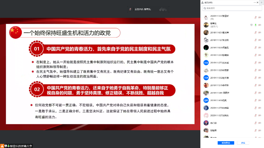 正值中国共产党建立101周年之际,为深入学习领会伟大建党精神,奋力担当践行党的初心使命,本科学生第六党支部于2022年7月3日中午十二点半在线上开展“中国共产党的百年历史使命”主题学习会,会议由郁章乐同志主持,全体党员同志参加。