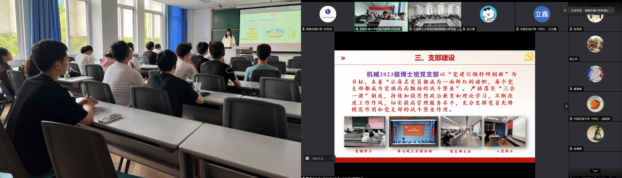 研究生之窗讯(记者 计丹 摄影报道)为深入学习贯彻习近平新时代中国特色社会主义思想和党的二十大精神,教育引导学生党员深刻领悟“两个确立”的决定性意义,不断增强“四个意识”、坚定“四个自信”、做到“两个维护”。按照“以共建促党建,以共建促科研,以共建促交流,以共建促发展”的原则,在双方上级党组织的领导下,在求真务实、真抓实干抓好自身建设的同时,加强交流联系,取长补短,合力打造高校共建交流平台。在践行落实筑牢高等院校基层党支部根基过程中,球王会官网球王会体育23级博士党支部、大连理工大学高性能制造硕博第六学生党支部和中国石油大学(华东)机电工程学院研究生高端装备制造学生党支部积极探索基层党支部联创共建新模式,跨出支部看支部、跨出学校看学校,通过开展线上、线下支部互联共建,拓展高校基层党支部间组织联建、党员互动、活动互联、资源共享的合力效能,努力形成校际间、科研间、支部间“党建工作共抓共促、资源互利共赢、先进经验共学共鉴”的一致目标,发挥联建党支部和党员的先锋模范作用,增强党支部的凝聚力和战斗力。