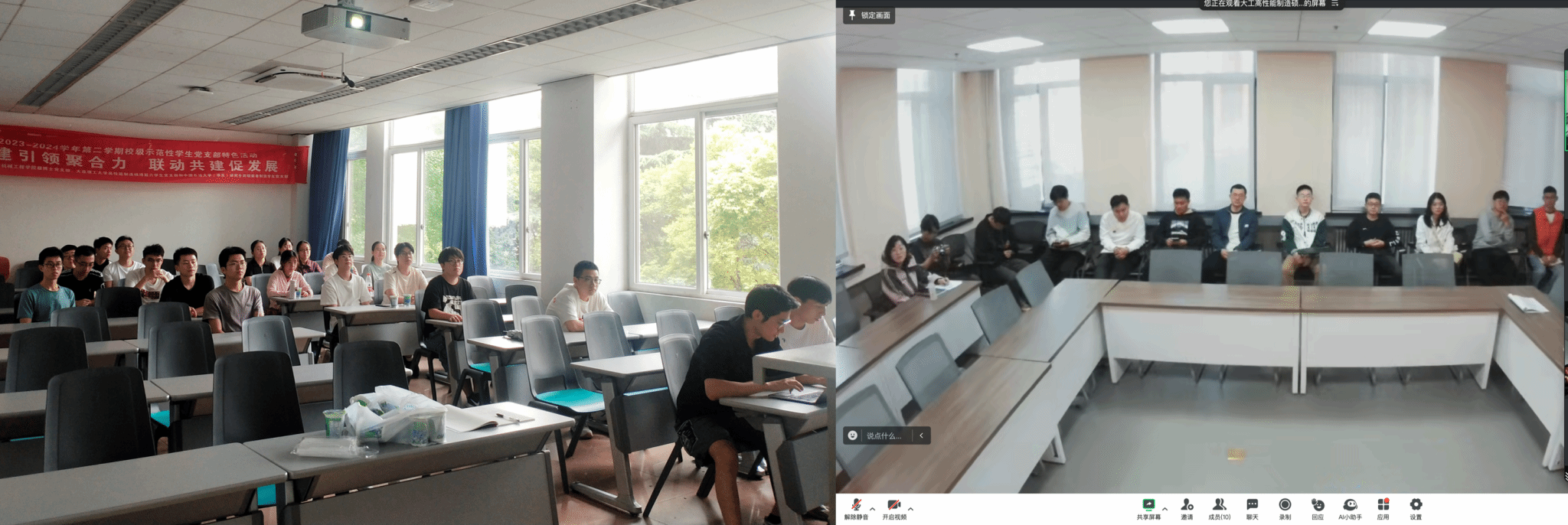 研究生之窗讯(记者 卢旭磊 摄影报道)5月24日下午,球王会官网球王会体育23级博士党支部、大连理工大学高性能制造硕博第六学生党支部和中国石油大学(华东)机电工程学院研究生高端装备制造学生党支部联合召开党纪学习教育主题党日活动,通过线上(腾讯会议)+线下座谈形式,就党纪学习教育开展主题党日活动等事项进行交流学习。三方支部全体党员参加会议。卢旭磊同志主持会议。
