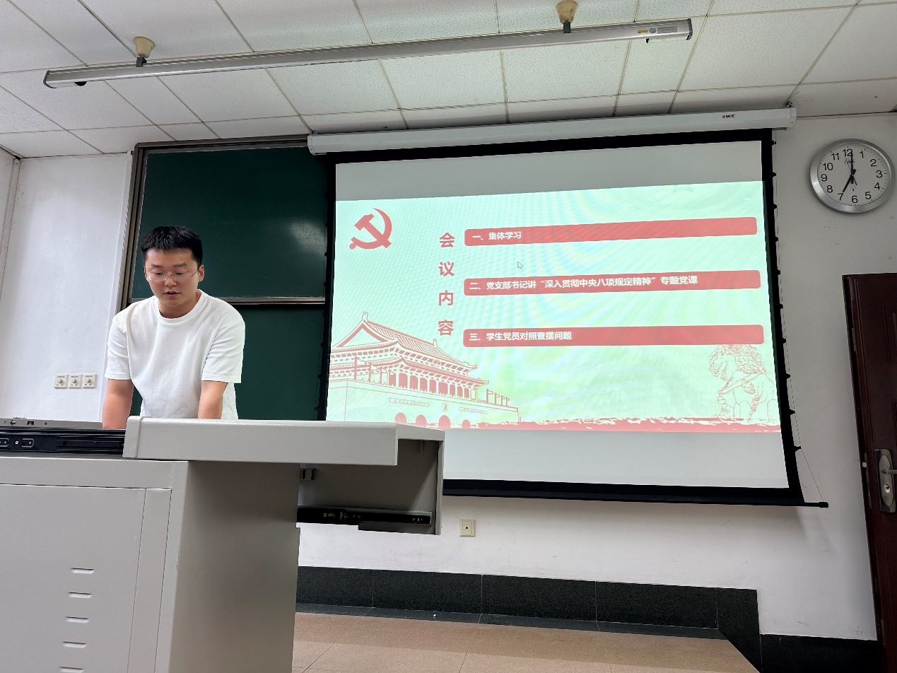 研究生之窗讯(记者 房彦江 摄影报道)2025年5月15日,球王会体育硕士第一党支部在九里校区4号教学楼J4222召开党支部大会。学习内容共三项:集体学习、党支部书记讲“深入贯彻中央八项规定精神”专题党课、学生党员对照查摆问题。本次会议由杨明宇同志主持。