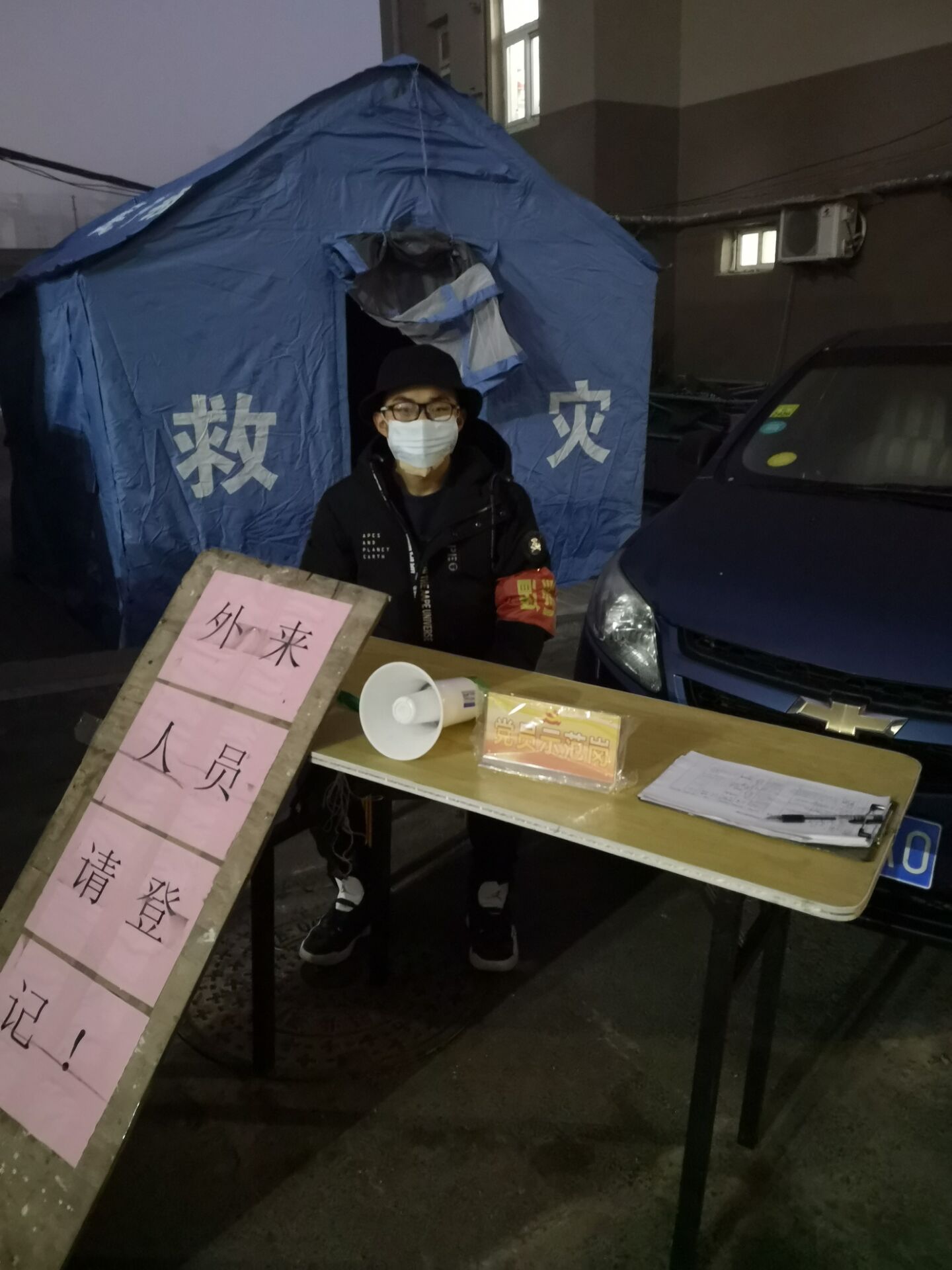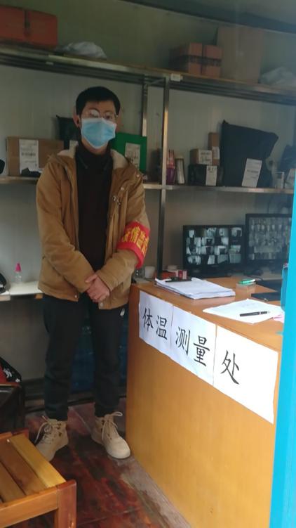 车辆2018-02班的牟鑫棚同学,每天值班,在高速路口对出入车辆进行审查、劝返、登记、体温检测。
