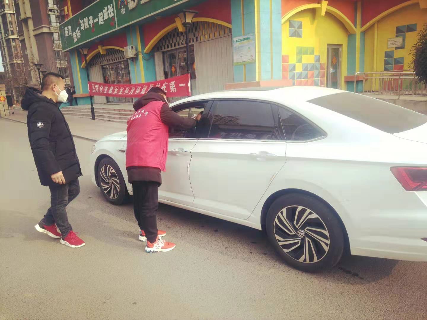 机械2017-08班的刘腾帅同学,每天上午对小区进出车辆进行登记、对进出人员进行体温测量。