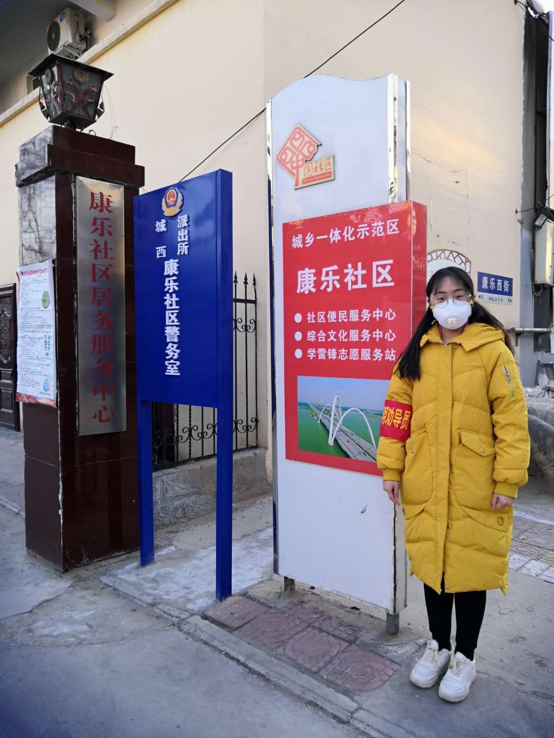 建环2017-01班的谷靖同学,志愿参与小区进出人员检查、测体温工作。