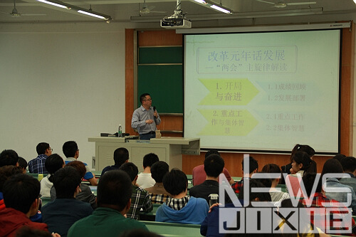 2014年4月21日晚19:30,球王会体育入党积极分子党课培训暨团校培训活动在4359教室开展,组织者有幸请到政治学院的严冰教授为大家带来“改革元年话发展——两会主旋律解读”主题讲座,为同学们解读两会中的改革问题。