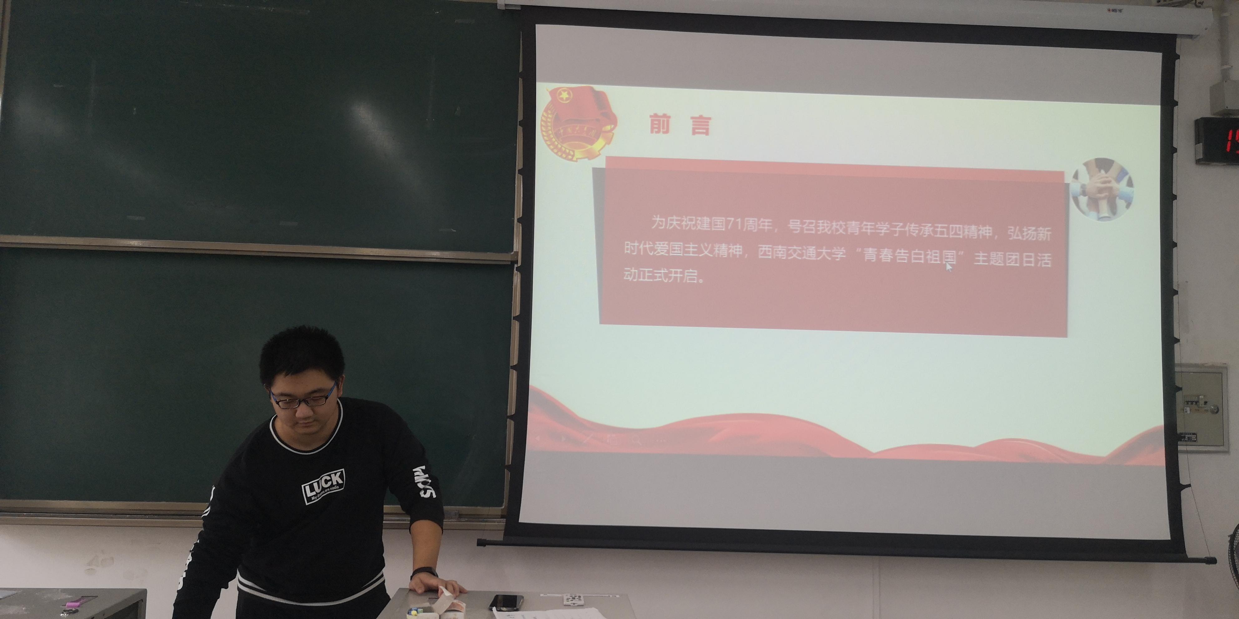 为弘扬新时代爱国主义精神,强化国家意识和集体观念,机械2017-04班团支部于10月18日15时30分于X2323举办以“青春告白祖国”为主题的团日活动。本次团日活动由班级团支部书记周文博同学主持,团支部全体同学到场参与。