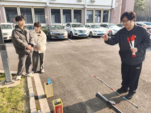 活动伊始,充满古典韵味的投壶游戏率先登场。同学们手持箭矢,屏息凝神,瞄准壶口奋力投掷。箭矢入壶时清脆的声响与同学们的欢呼声交织在一起,现场洋溢着欢乐的氛围。