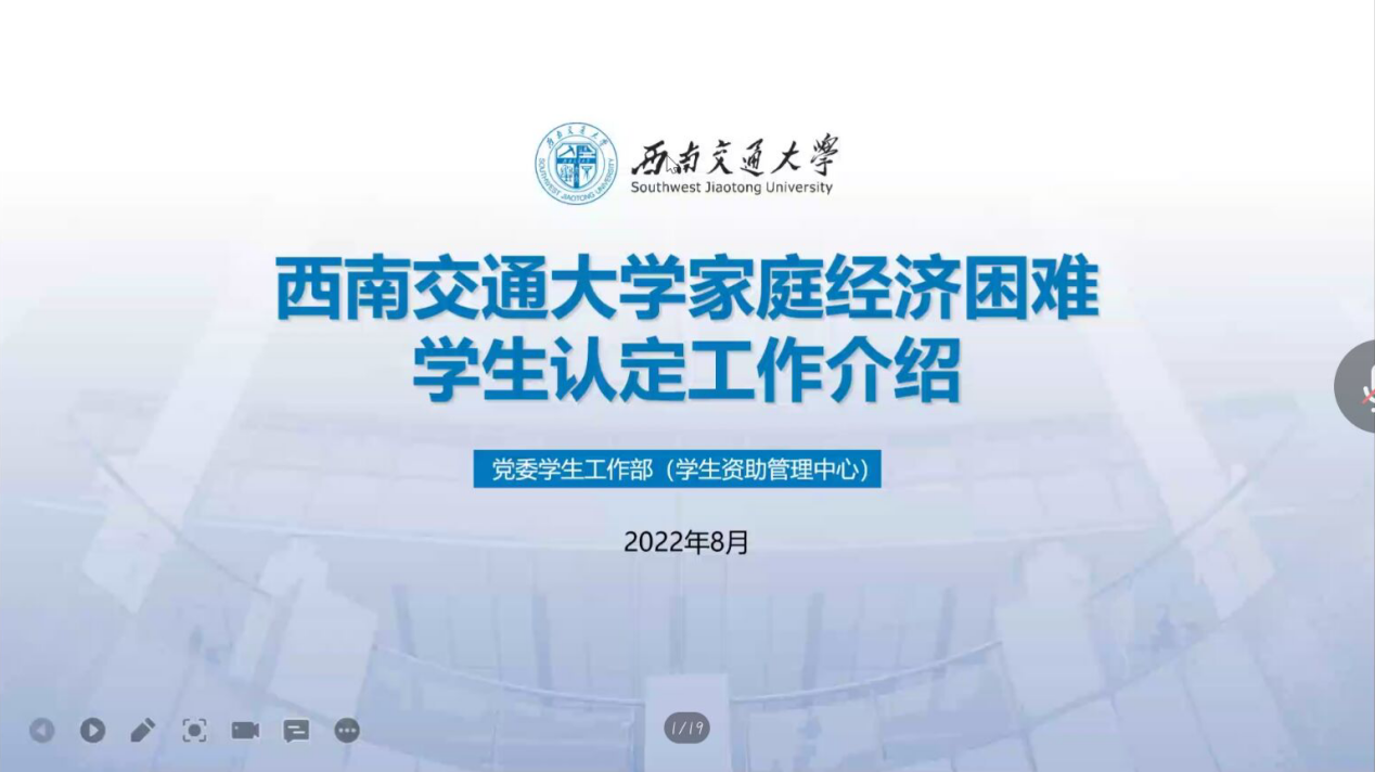 2022年8月30日19:00,由于近期疫情防控形势严峻,球王会体育于线上举行了2022级新生资助专题讲座。本次讲座针对新生关于奖助学金、贫困认定、勤工助学等事务进行详细讲解。参与本次会议的人员有学生资助中心米艳老师、辅导员邓慧心老师、罗晗葳老师、李曦老师,以及球王会体育2022级新生。