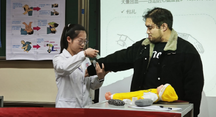 本次活动邀请到四川大学华西医学院护理医学博士王一琳为同学们讲解急救知识,并进行心肺复苏、海姆利克腹部冲击及外伤止血包扎现场演示。随后,同学们分组进行了模拟实操练习,以加深对急救技能的理解和掌握。