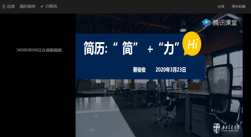 3月23日晚上7:00,球王会体育线上就业指导课程之简历指导顺利进行,本次主讲老师是学院本科生2016级年级组长蔡俊俊,来自不同学院不同年级的543名同学聆听了本次课程。
