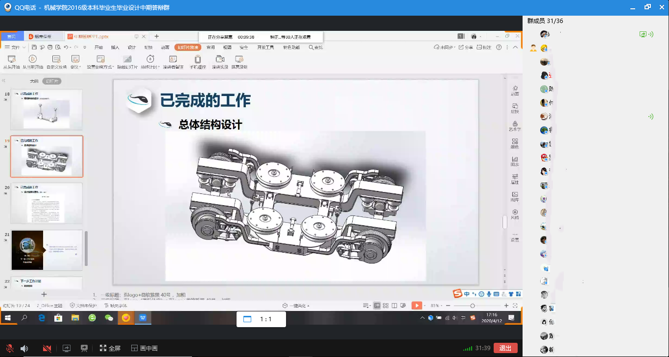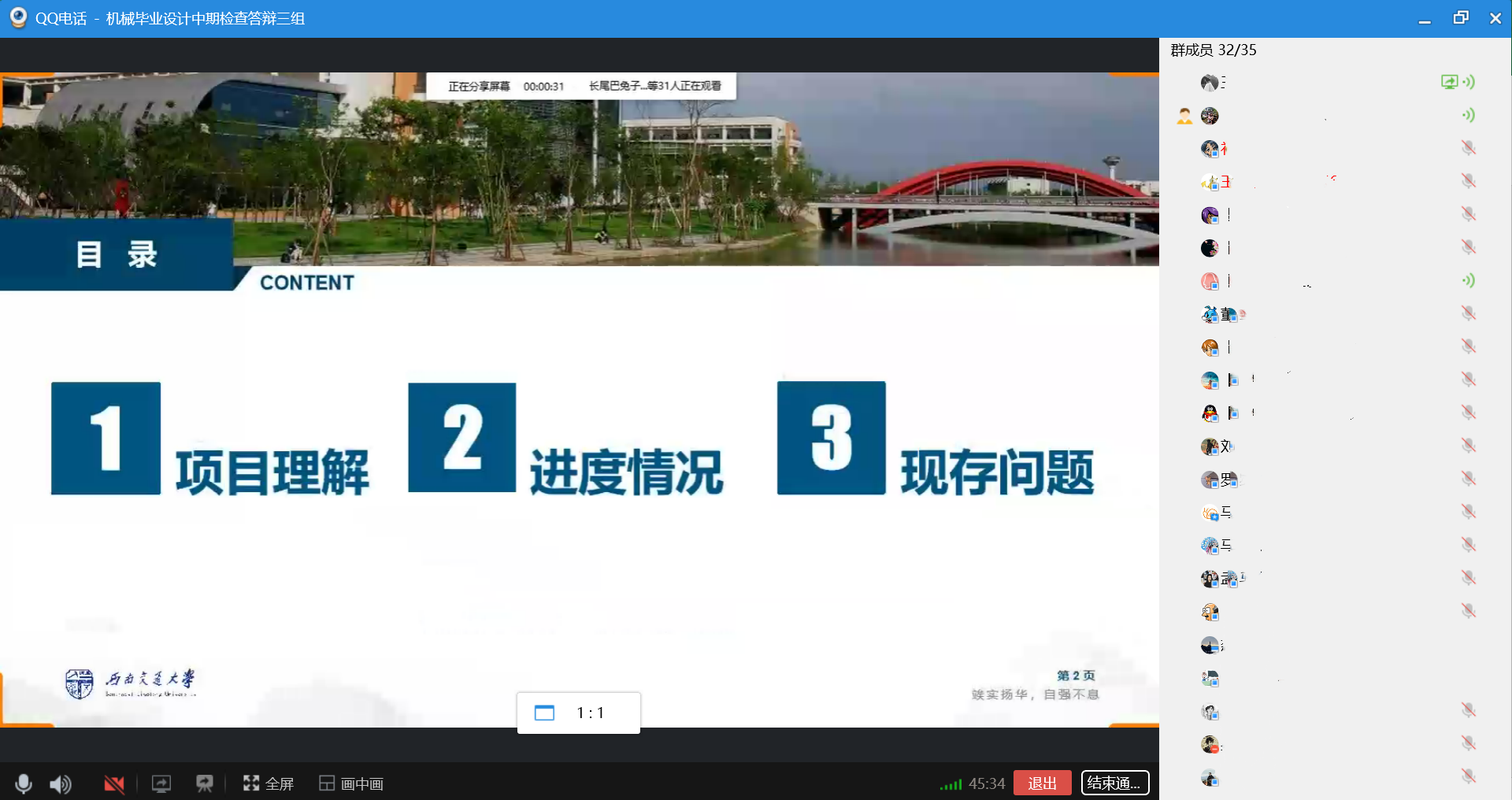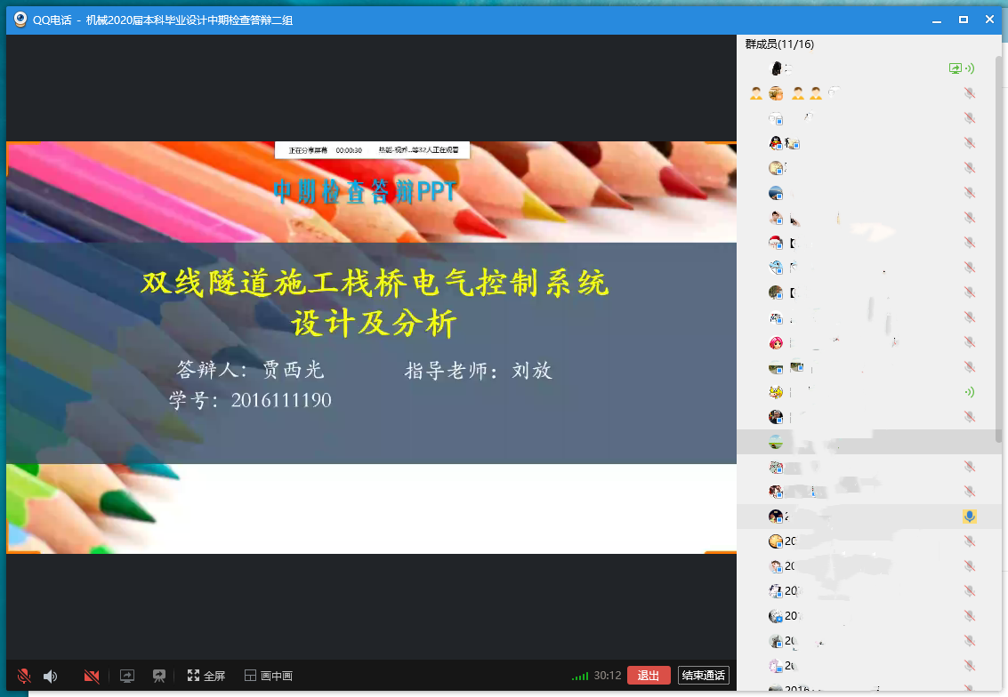 为充分了解学生毕业设计(论文)进展情况,学院发布《学院2020届本科生毕业设计(论文)校级中期检查抽查答辩安排》,对学生答辩时间和答辩内容进行要求。每位学生答辩时间为8-10分钟,围绕三个部分内容进行汇报:1.对毕设题目的理解;2. 目前毕设完成情况;3. 存在的问题或下一步工作计划。答辩前,各答辩小组秘书组织师生进行了网络测试,学生熟悉平台使用和屏幕分享等功能,并对线上答辩有可能出现的情况进行了周密的预案。答辩中,评委老师根据学生的汇报,针对毕业设计(论文)中出现的问题提出解决方案和参考意见,更好的帮助学生明确下一步工作方向。