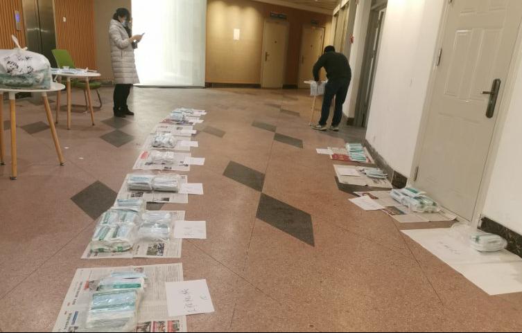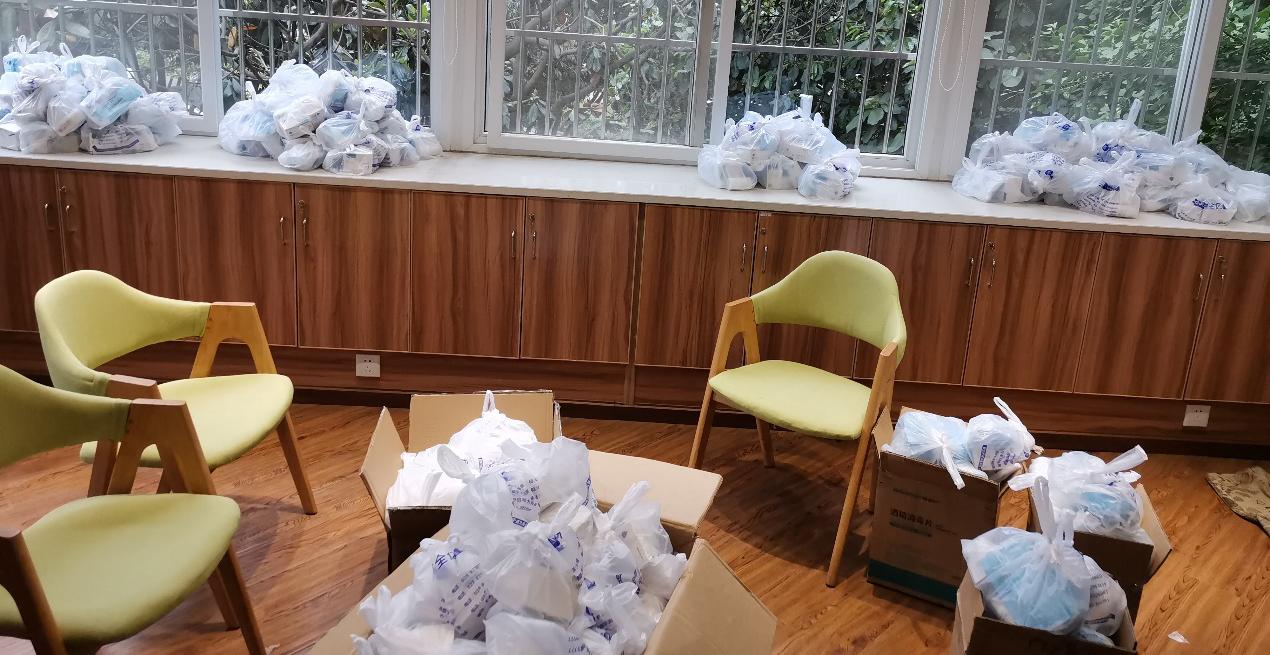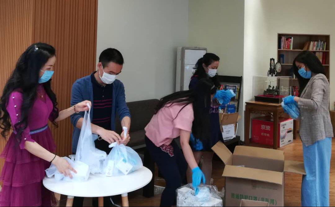 在分装物资的时候,支部成员都各自带好口罩,做好消毒工作,尤其是分装口罩的同事,都带上了医用手套,做好源头防护,切实为教工送关怀。