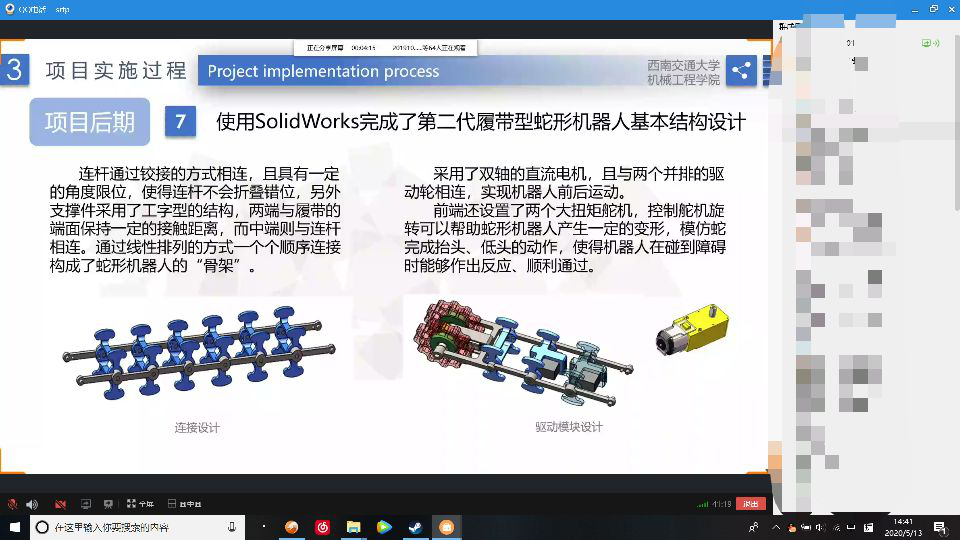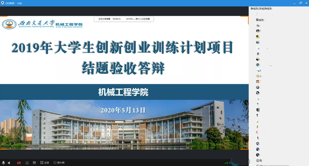 2020年5月13日下午14时,球王会官网球王会体育2019年大学生科研训练项目(SRTP)结题答辩,在QQ群中通过群语音及屏幕分享的方式举行。本次线上答辩分成两组,副院长田怀文和院质保委员、机电测控系副主任陈春俊担任答辩组长,院质保委员秦萍、王月明、潘亚嘉、周斌,院教工委员邓斌、孟祥印、丁军君,机车车辆系主任黄运华等担任答辩评委,项目组指导教师以及28个项目组全体同学参与本次答辩活动。