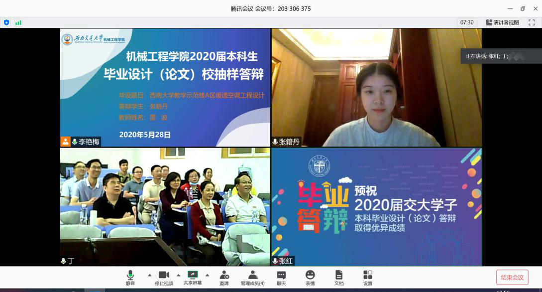 中午12时30分,本次毕业设计(论文)校抽样答辩圆满结束,为减少线上答辩带来的遗憾,学院组织评委老师和答辩同学进行网上合影留念,为答辩同学带来满满的仪式感,也为大学四年画上一个圆满的句号。