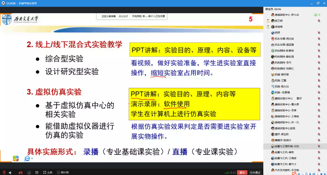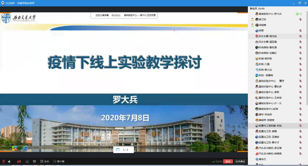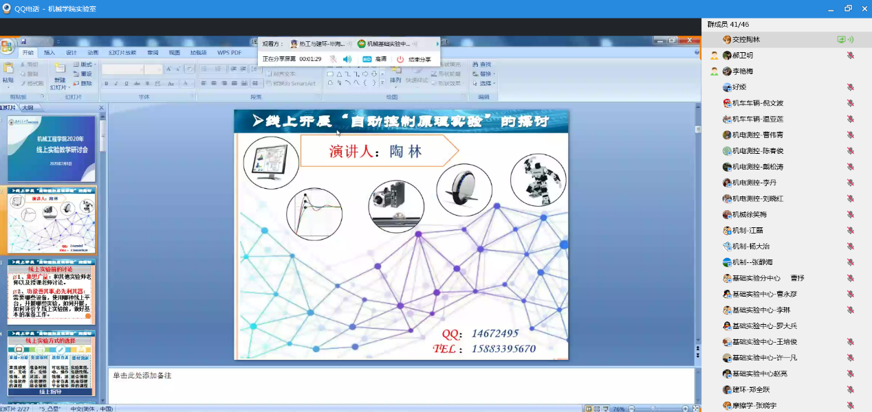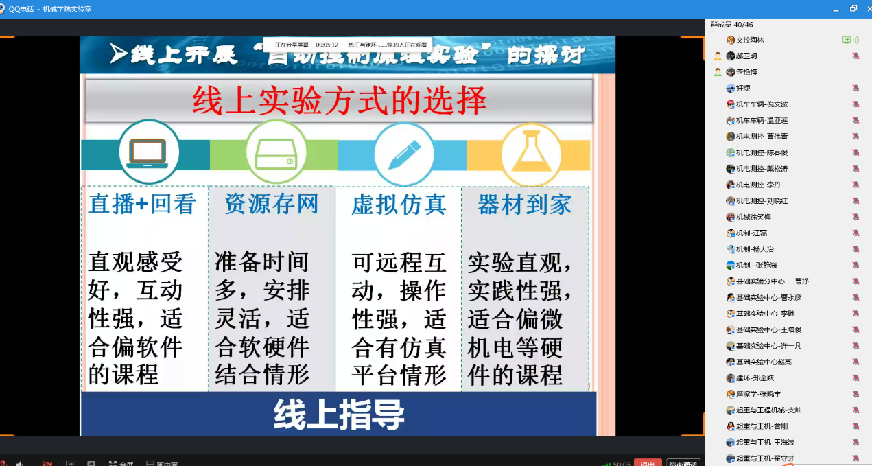 会议由学院分管实验室教学的曾东红副院长主持,学院教工委副主任、机械设计教研室主任罗大兵在线做了题为《疫情下线上实验教学探讨》的直播报告;接着,交控系实验师陶林结合“自动控制原理实验”在线分享了自己在线开展实验教学的经验和体会。