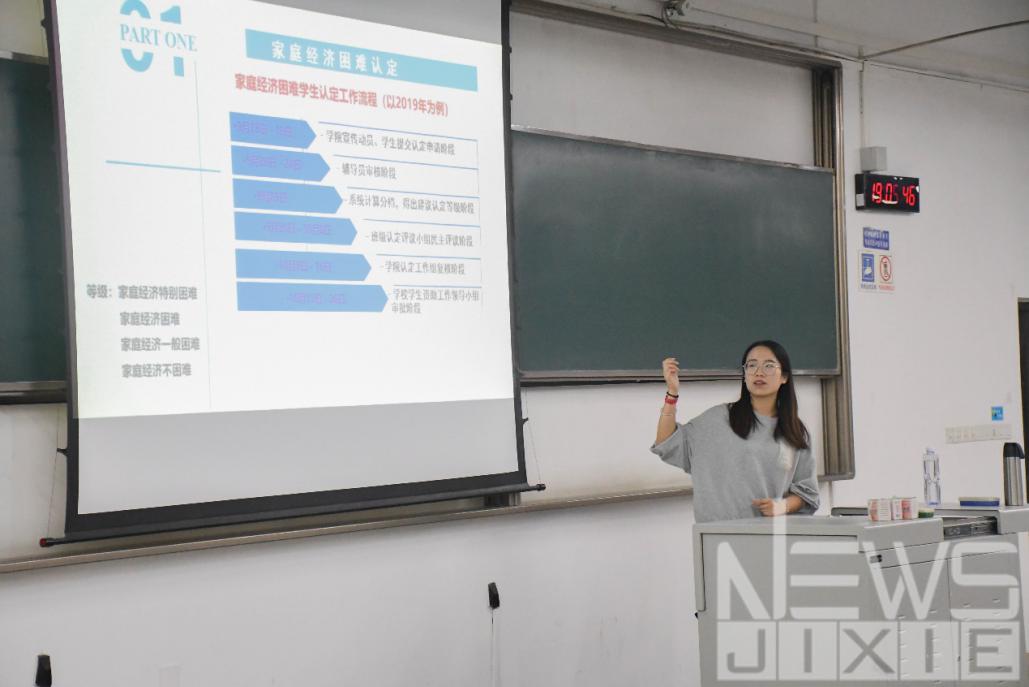 首先,廖思璐老师向各位同学讲解家庭经济困难认定的相关情况。家庭经济困难认定是所有资助及助学贷款的基础,需要同学提交认定申请交由辅导员审核,通过后交由系统计算分档,并分出特别困难、困难、一般困难、不困难四个等级。得出评价等级后需要进行班级内部民主评议,并由学院认定工作组复核,审批通过后最终确定认定等级。