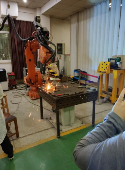 紧接着同学们在陈老师的带领下来到实验室近距离参观各种焊接设备,正所谓“百闻不如一见”,各式各样的设备极大的开拓了同学们的视野,让同学们眼花缭乱:看似笨重的机械臂却不失灵活,在小小的一方天地打造他的梦想;大块头机器“心有猛虎,细嗅蔷薇”,在肚中默默酝酿成品……在实验室中,同学们有幸看到学长应用设备焊接的过程,见识到了焊接设备的工作情况,得以大饱眼福。