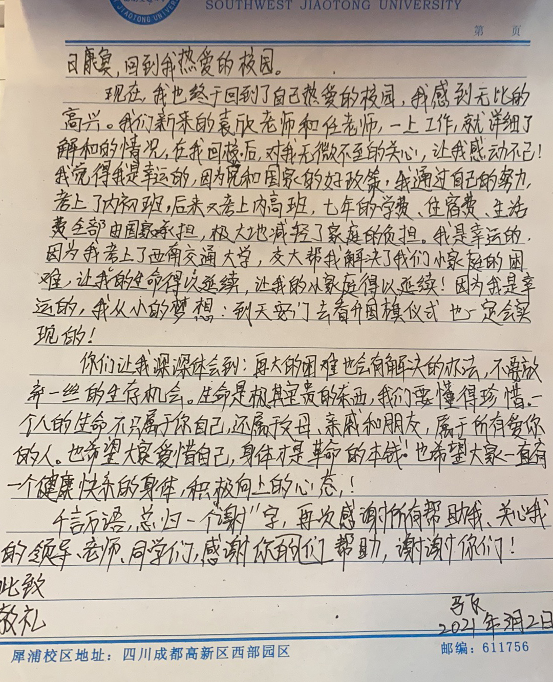 “感谢你们伸出仁爱之手,让我们有了战胜病魔的勇气和力量!”在学工部领导和学院师生齐心帮助下,马飞得到了及时的治疗,手术很顺利,目前马飞处于康复期,身体状况良好。“还记得我术后躺在病床上时,麻醉过后的疼痛感,让我整天精神萎靡,昏昏迷迷。”马飞回忆起当时的经历,“但每天都有许多电话、信息来问候我,鼓励我”。学院师生用实际行动落实推进学生资助政策,彰显教育扶贫力度,确保全院家庭困难学生、因病致贫学生“有学上,上好学”。