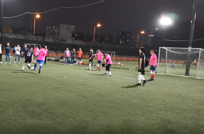 随着裁判一声哨响,比赛正式开始。身穿黑色球衣的机械足球队率先持球进攻,场上队员配合娴熟,通过传球拉开对手的防线,伺机寻找机会。身穿粉红色球衣的物理二队则充分利用身体优势,对持球队员进行防守拦截。双方你来我往,比赛异常激烈。上半场比赛至十分钟左右,机械学院15号谢永亮抓住空档,一脚射门洞穿了物理二队门将的十指关,1:0,球王会体育足球队取得领先!随后,机械学院18号刘光帅、19号温华各入一球,机械学院以3:0的比分结束了上半场比赛。下半场双方易边再战,物理二队利用反击打进一球,而后机械学院温华、刘光帅又各入一球,将最终比分锁定在了5:1。