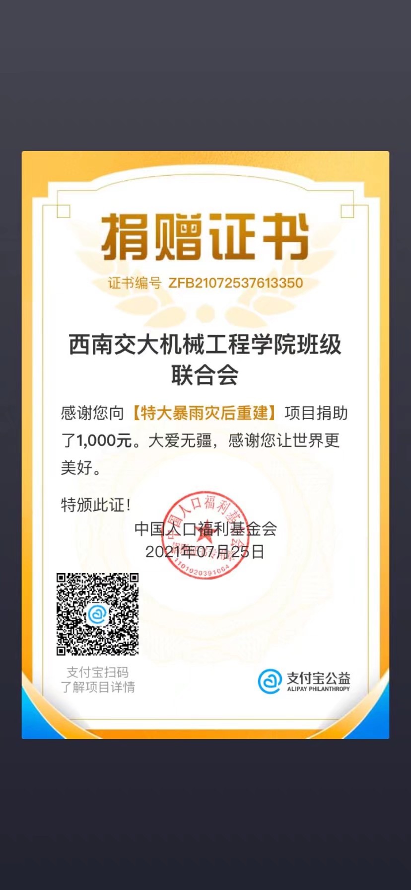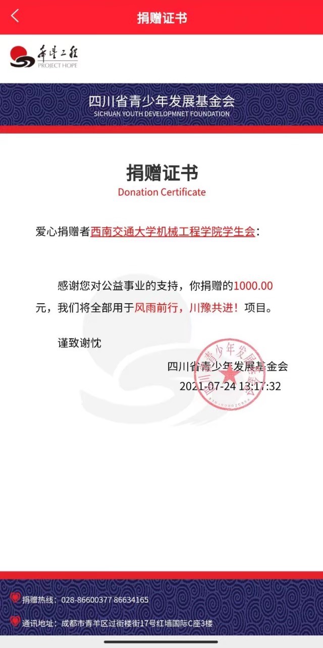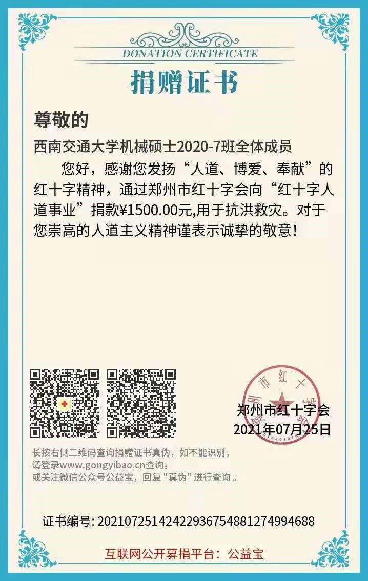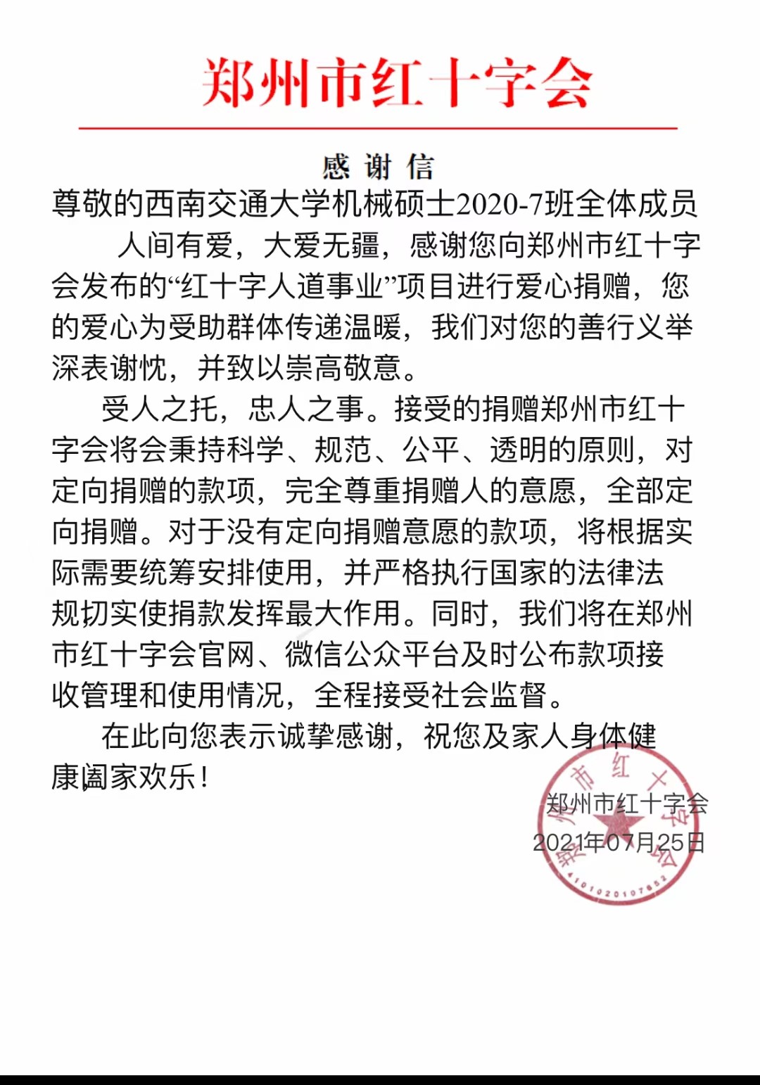学院团学组织及学院各班级同样重视此次灾情,各团学组织及班级都在积极关心并援助河南。其中球王会体育学生会,球王会体育班级联合会各捐款人民币1000元,机械硕士2020-07班捐款人民币1500元。