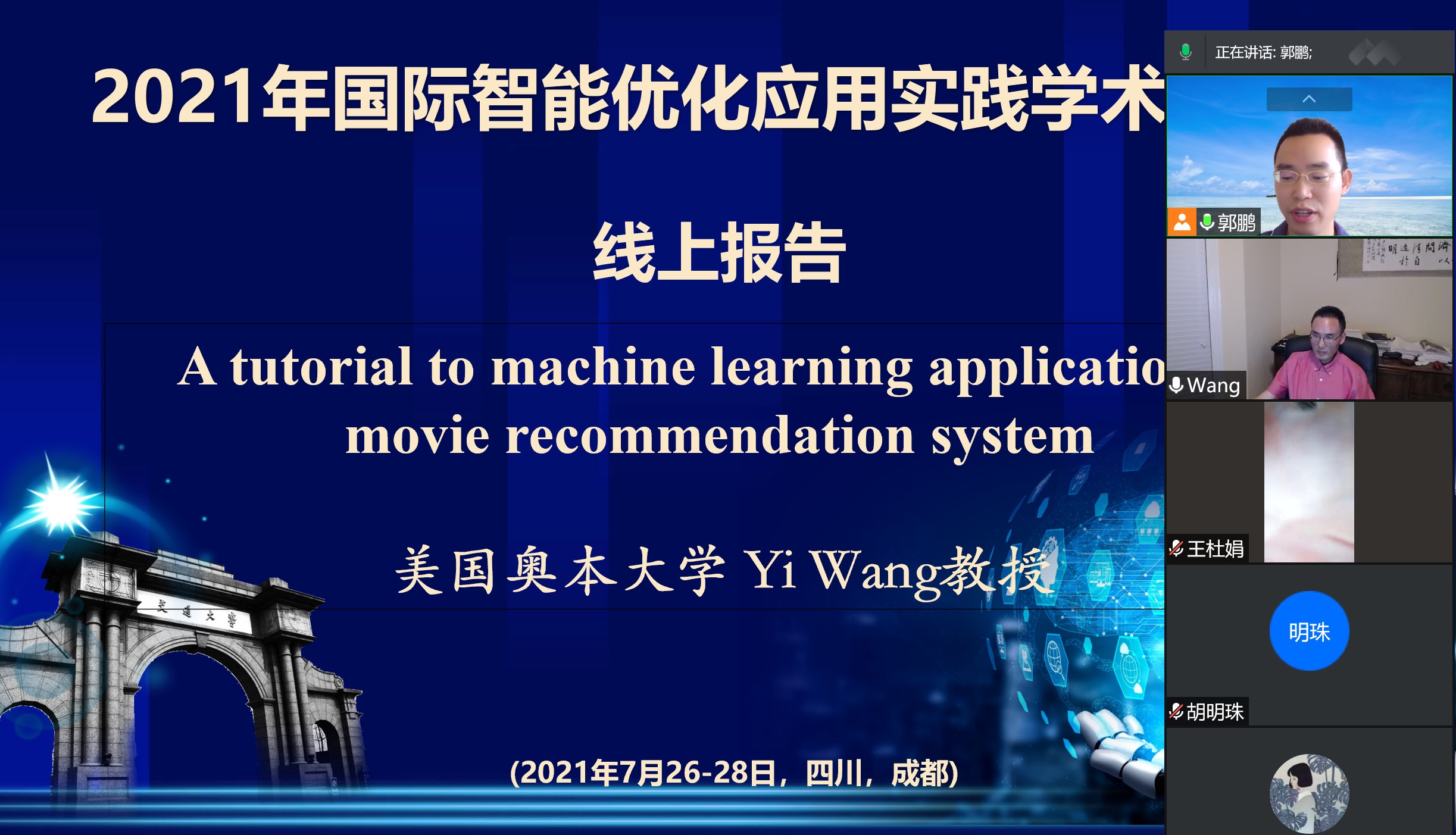 7月28日的线上交流邀请了奥本大学Yi Wang教授和香港理工大学潘凯助理教授作报告。Yi Wang教授从大数据挖掘下的电影推荐系统切入,介绍了如何使用R语言构建机器学习框架。潘凯教授以电网市场中存在的调度优化问题为对象,详细介绍了问题的提出、模型与算法的设计。两场报告持续3个半小时,与会人员与两位教授进行了深入的交流。线上报告环节由郭鹏副教授主持。