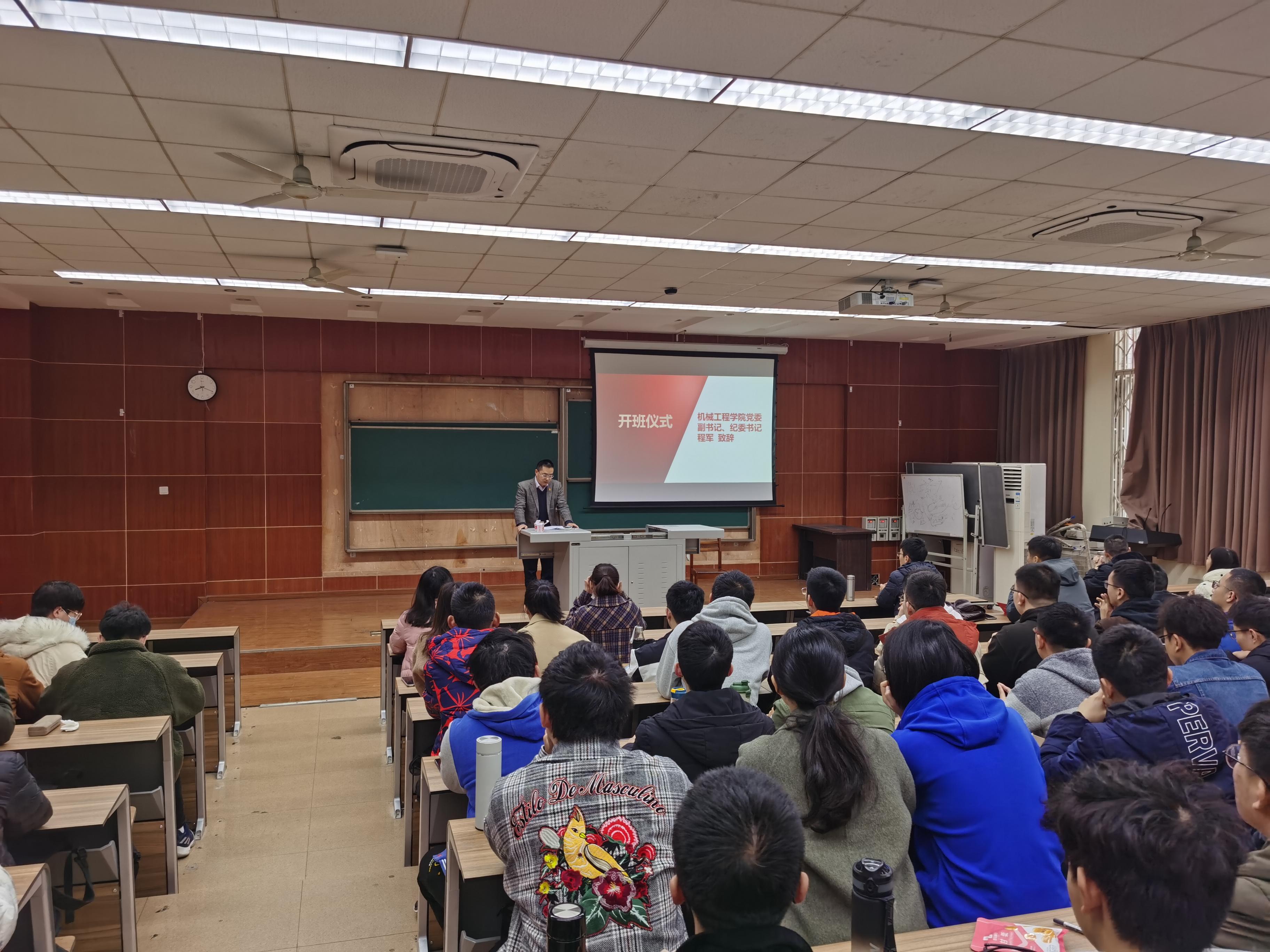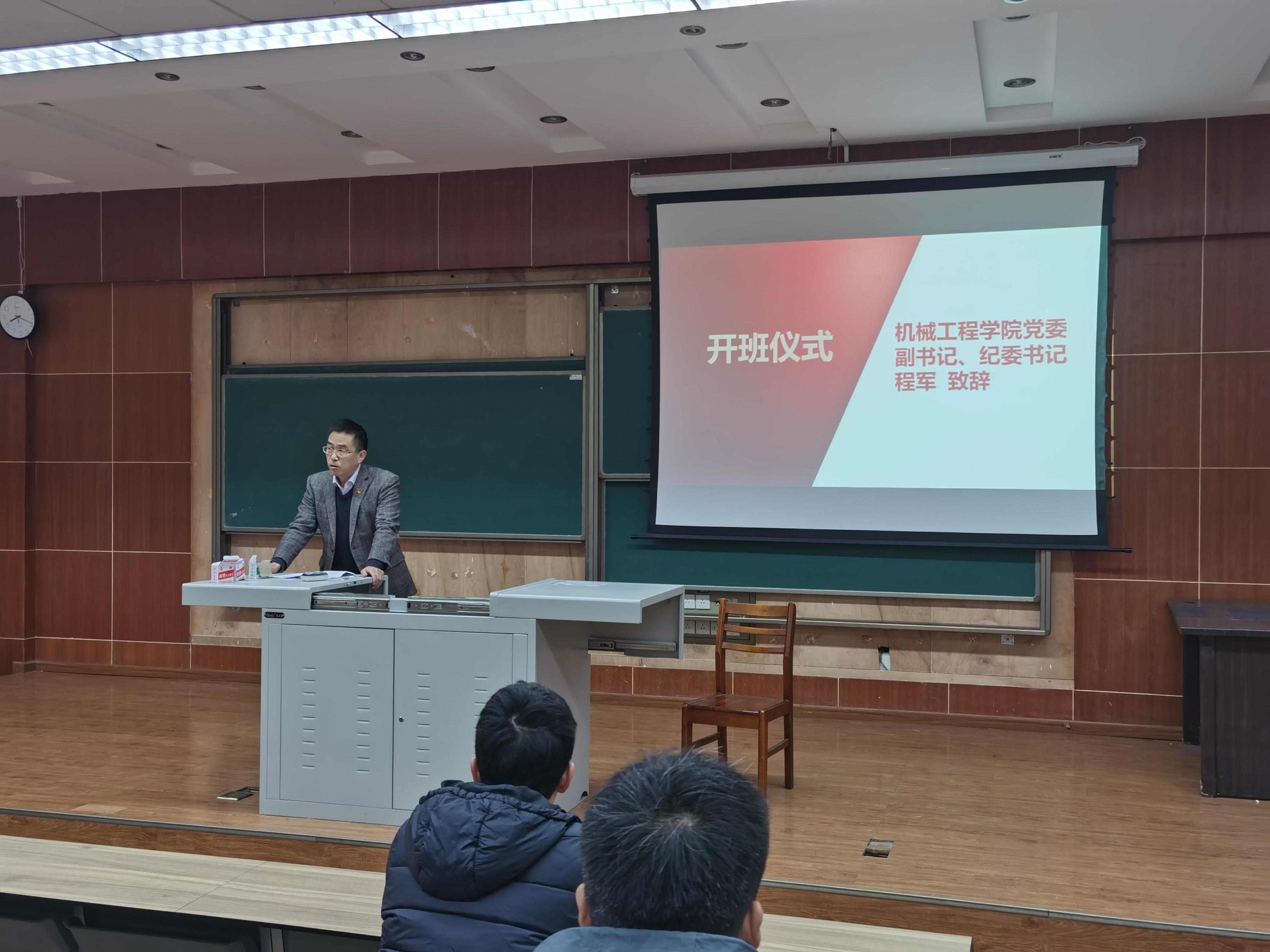 九里校区会场由徐喆老师主持开班仪式。会上,学院党委副书记、纪委书记程军发表致辞。程书记首先欢迎了新一期参加党课培训班的各位学员们,并对学员们的学习和成长寄予热切希望。随后程书记阐述了设立入党积极分子党课培训班的意义,一是因为学员们此前个人学习接触到的大部分都是零散的理论知识,只有通过培训班才能系统地学习党的理论知识;二是通过培训班的学习,学员们可以进一步地提升自身的思想政治觉悟;三是办理党课培训班也是严格党员发展程序的必要流程。因此,程书记希望每一位学员都认真对待这次党课培训,做到思想重视,认真学习相关课程,争取最大的收获。