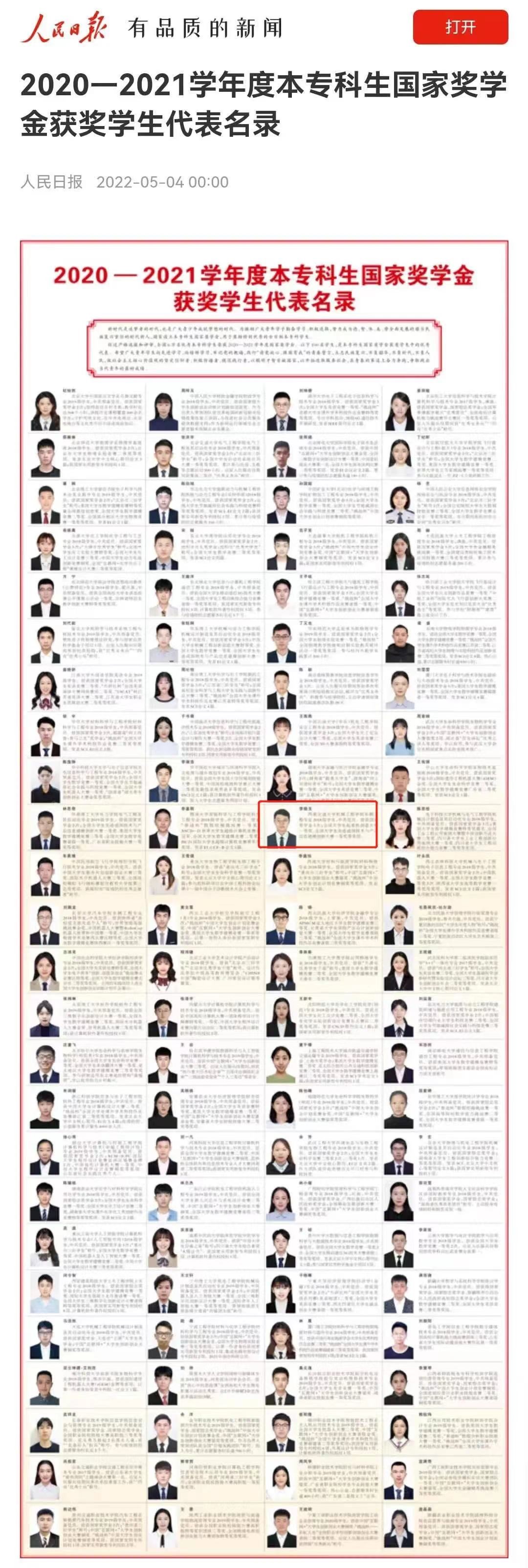 2022年5月4日,为激励广大青年学子勤奋学习、积极进取,努力成为德、智、体、美、劳全面发展的堪当民族复兴重任的时代新人,人民日报刊发本专科生国家奖学金获奖学生100名代表名录,球王会体育2018级本科生李晓玉从全国6万名国家奖学金获得者中入选。