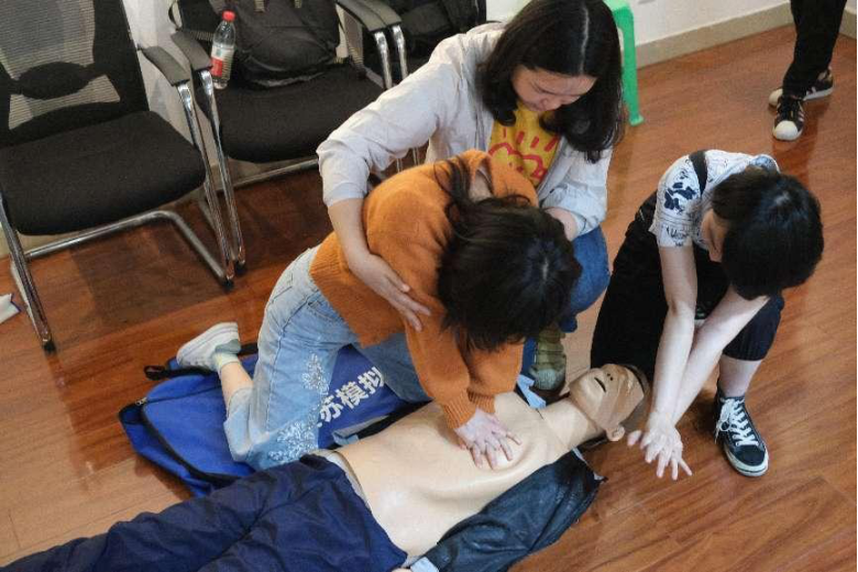 随后,西南交大医学院党员先锋队的研究生同学们通过假人向辅导员老师们展示如何正确进行心肺复苏急救,生动地展现了如何正确地对昏迷人员进行心肺复苏急救。随后主讲同学邀请辅导员老师亲身体验心肺复苏急救法的过程。过程中,主讲同学细致入微地纠正了辅导员老师们的手型和姿势上的错误,并提到了一些容易被忽视的环节,如对于环境的观察评估和对周围人员的呼救求助。最后,西南交大医学院党员先锋队带领辅导员老师们一同观看了海姆立克急救法的相关视频,学习了海姆立克急救法的操作流程,教会大家如何处理异物堵塞气管的情况。