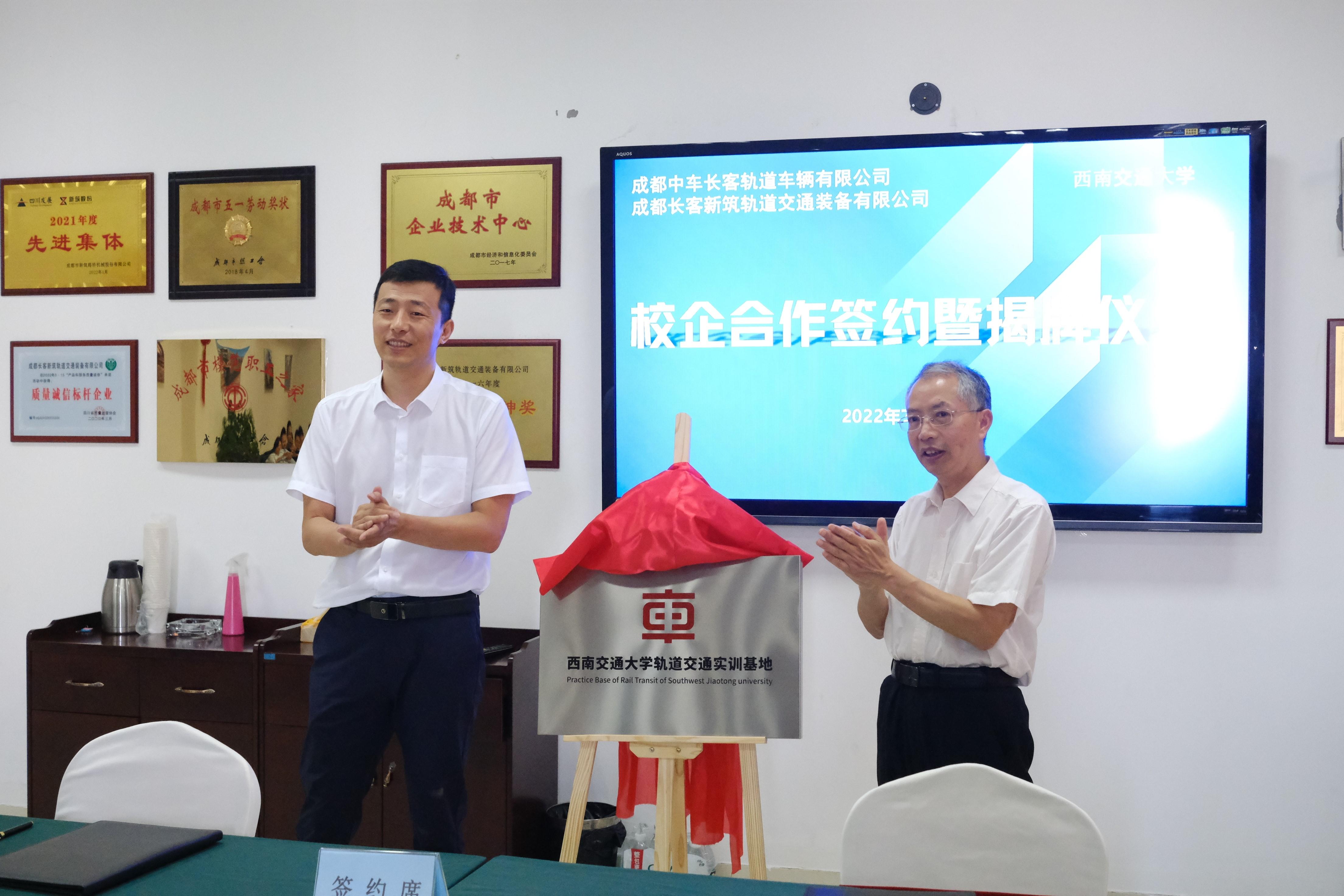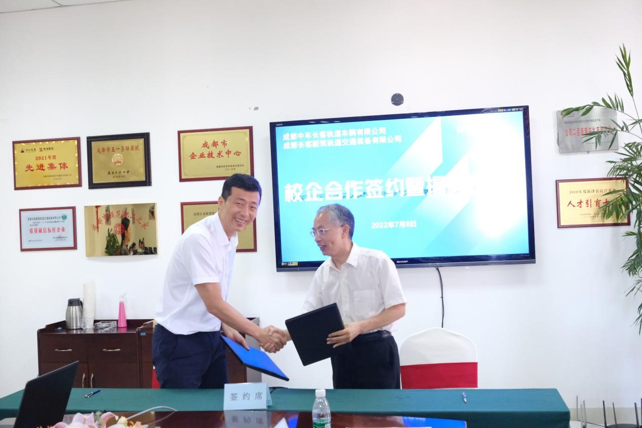 2022年7月8日上午,球王会体育与成都中车长客轨道车辆有限公司、成都长客新筑轨道交通装备有限公司校企合作协议签约暨轨道交通实训基地揭牌仪式顺利举行。