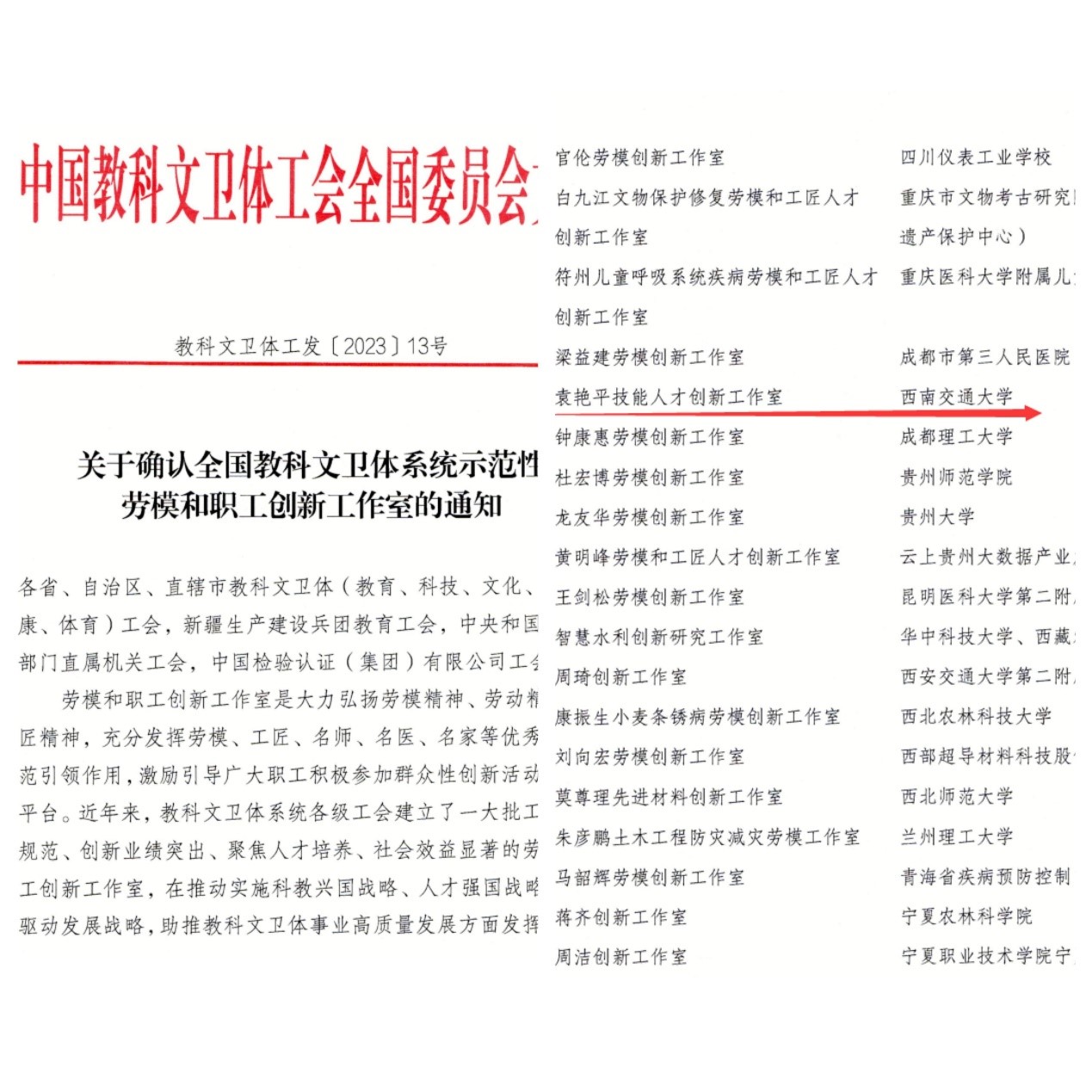 近日,中国教科文卫体工会全国委员会发布《关于确认全国教科文卫体系统示范性劳模和职工创新工作室的通知》(教科文卫体工发〔2023〕13号),我院袁艳平技能人才创新工作室被选树为全国教科文卫体系统示范性劳模和职工创新工作室,成为我校首个全国教科文卫体系统示范性劳模和职工创新工作室。全国共有98个工作室光荣上榜,这是中国教科文卫体工会首批命名的全国示范性劳模和职工创新工作室。