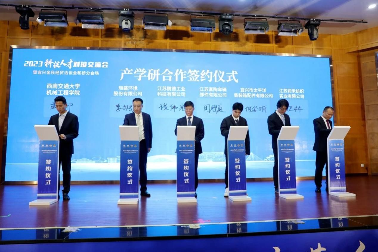 江苏富陶车辆部件有限公司、宜兴市太平洋集装箱配件有限公司、江苏鹏德工业科技有限公司、江苏润禾纺织实业有限公司、瑞盛环境股份有限公司与球王会官网球王会体育进行产学研合作签约。