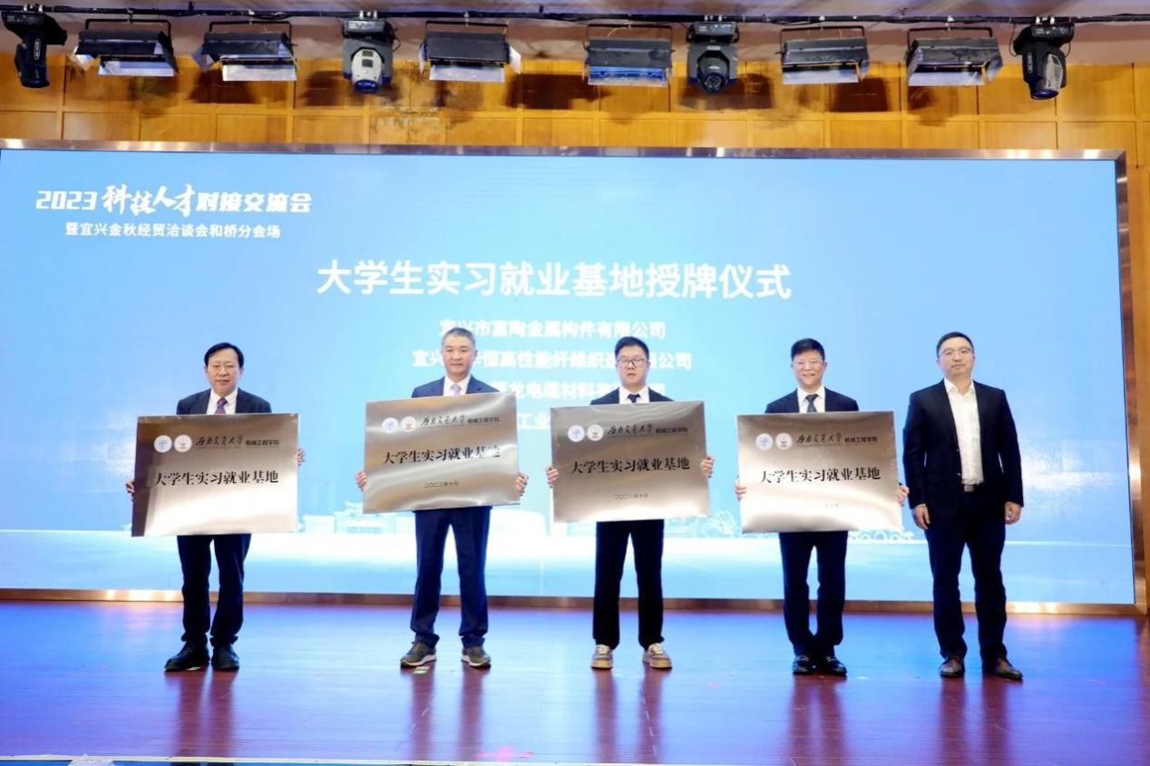 球王会官网球王会体育副教授丁军君代表学院向宜兴市富陶金属构件有限公司、宜兴市华恒高性能纤维织造有限公司、无锡市恒龙电缆材料有限公司、江苏鹏德工业科技有限公司授予大学生实习就业基地。