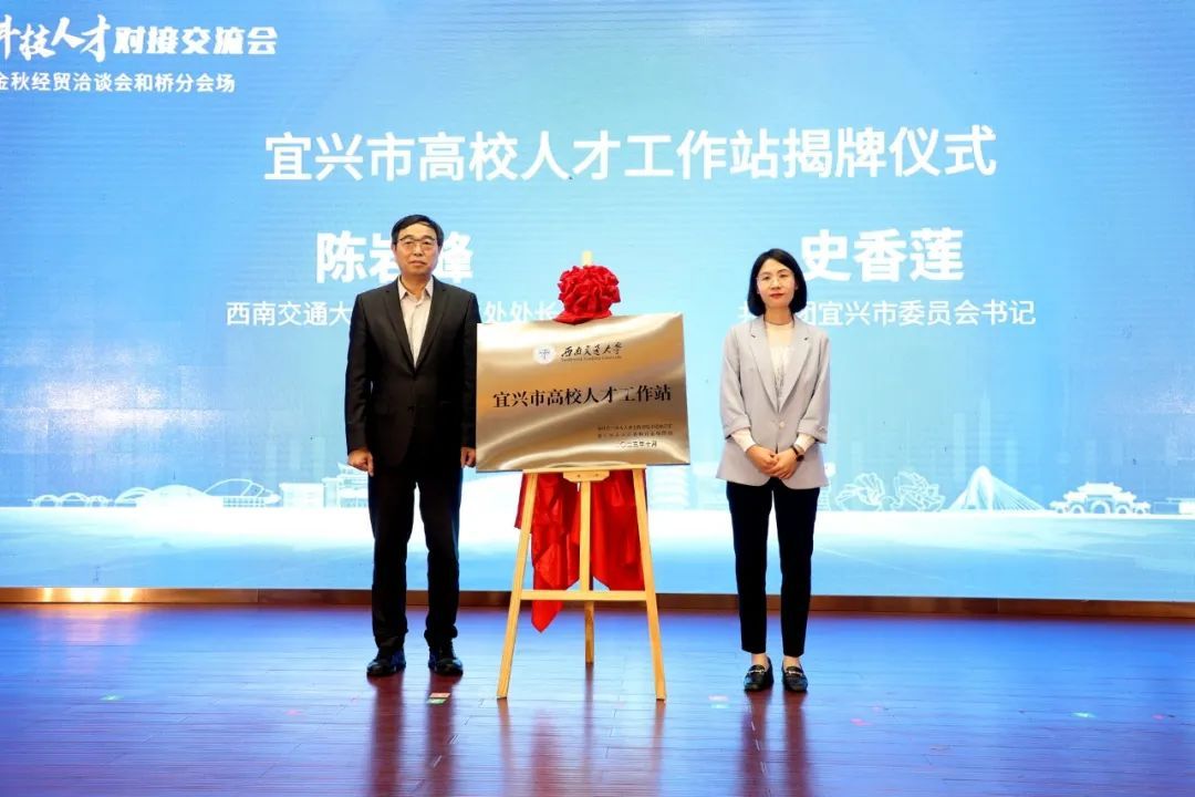 球王会官网招生就业处处长陈岩峰和共青团宜兴市委员会书记史香莲为宜兴市高校人才工作站揭牌。