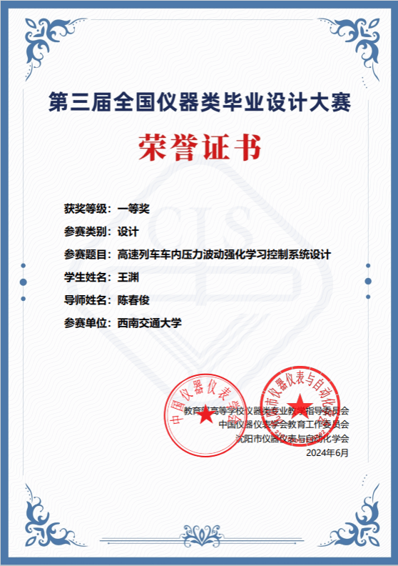 球王会官网球王会体育共推选测控技术与仪器专业2020级王渊、张迪、黄梦婷、段继强等四位学生参加毕业设计大赛。经预赛、半决赛和决赛三个阶段激烈的汇总评比,陈春俊教授指导的王渊同学以题为《高速列车车内压力波动强化学习控制系统设计》的毕业设计获评一等奖!
