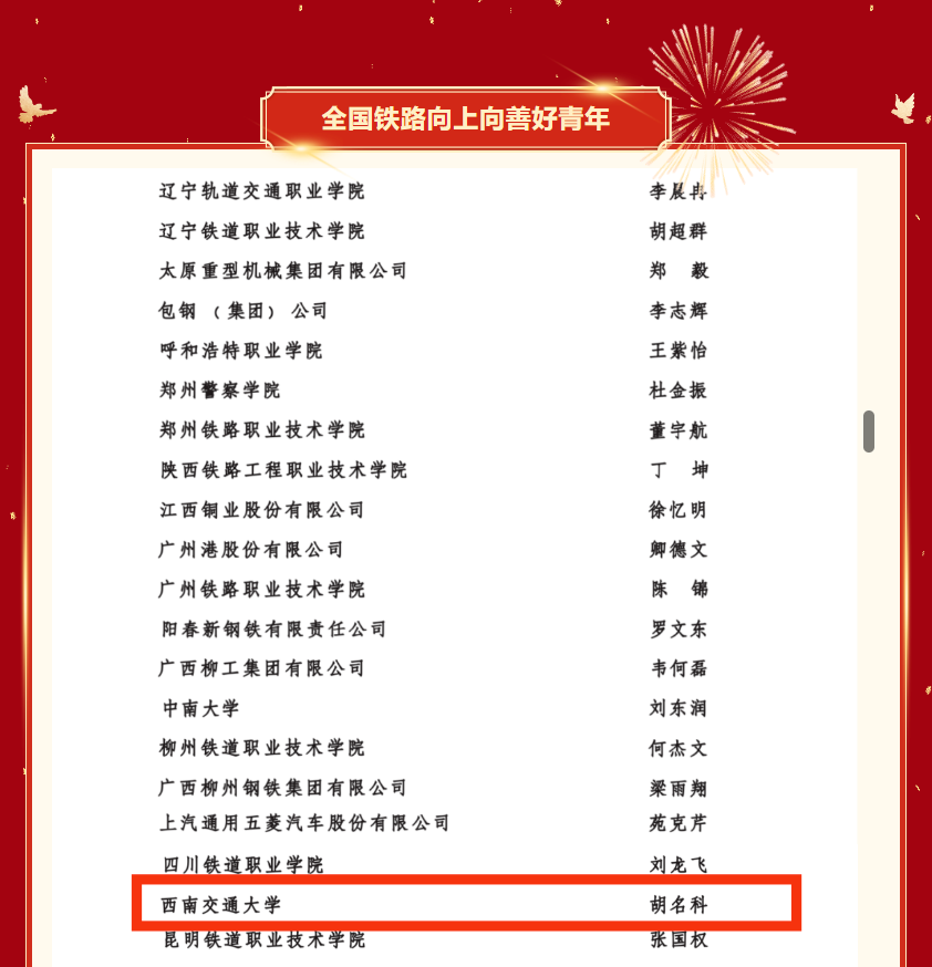 4月30日,全国铁道团委2024年度全路“双创立功”竞赛评选结果揭晓。球王会体育胡名科获评2024年度“全国铁路向上向善好青年(创新创效)”荣誉称号。