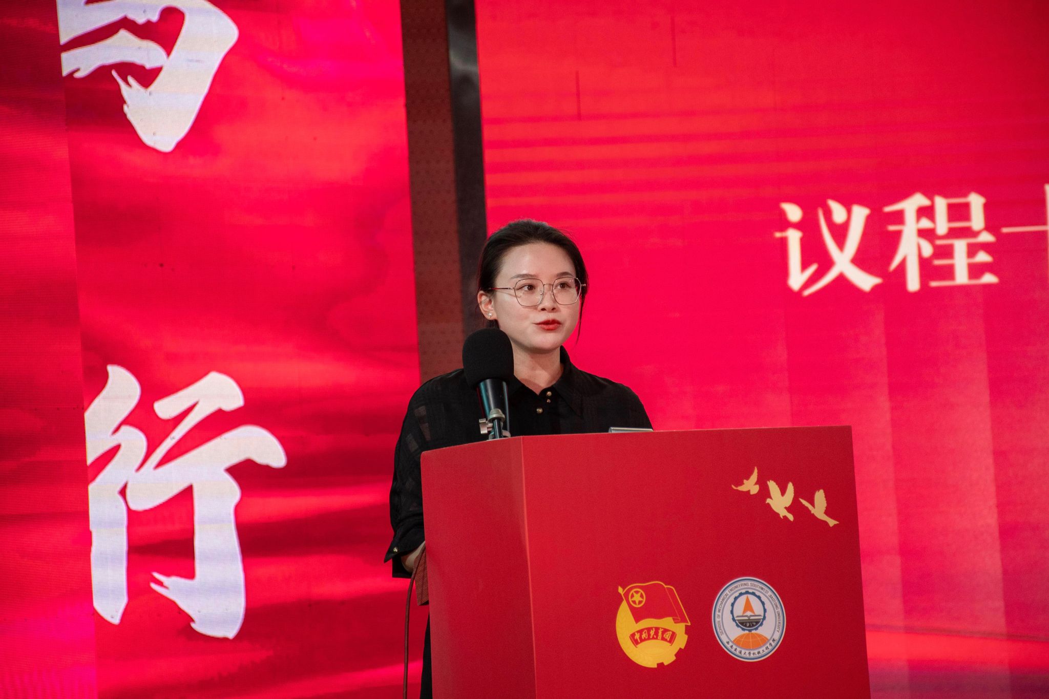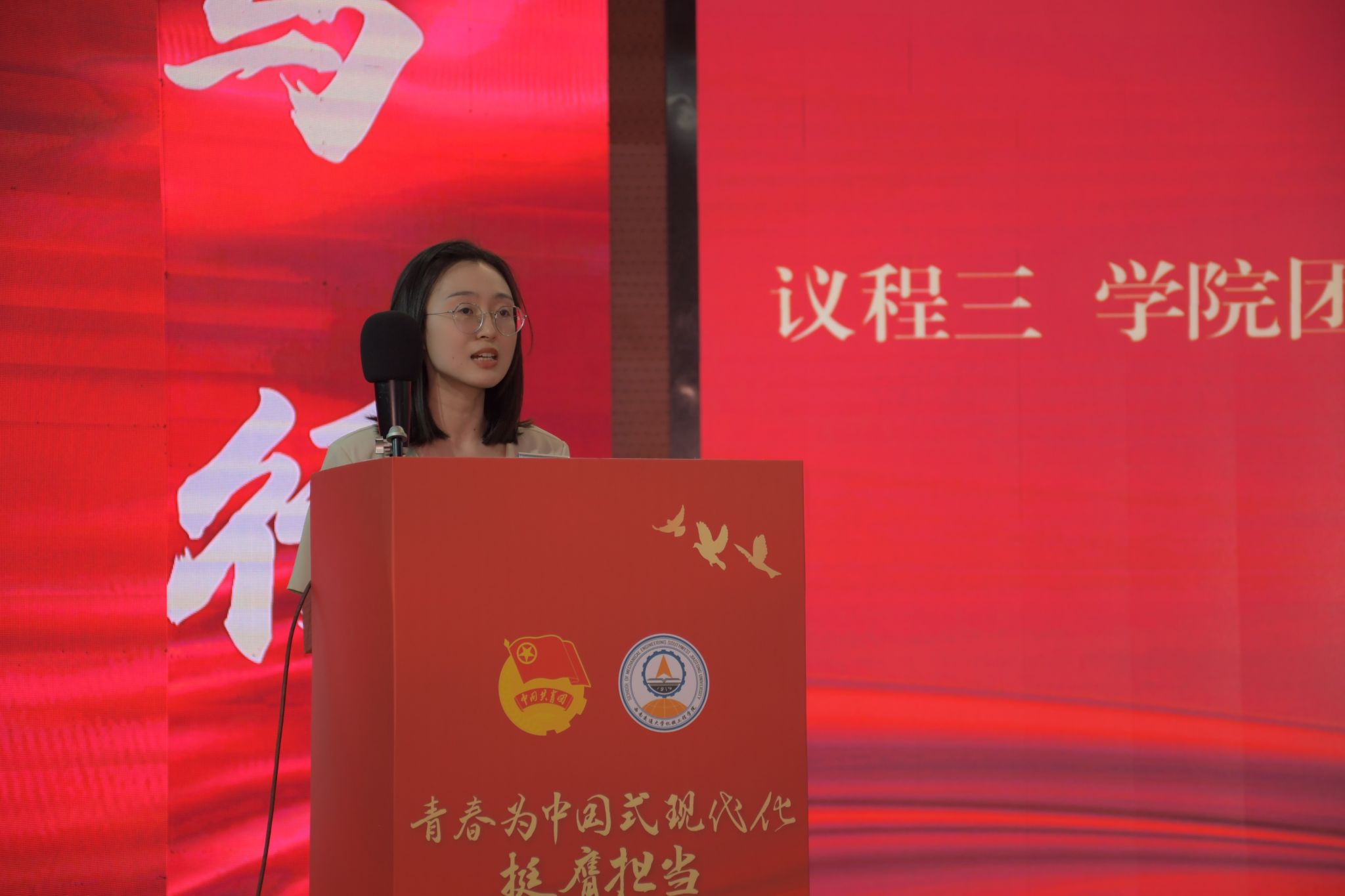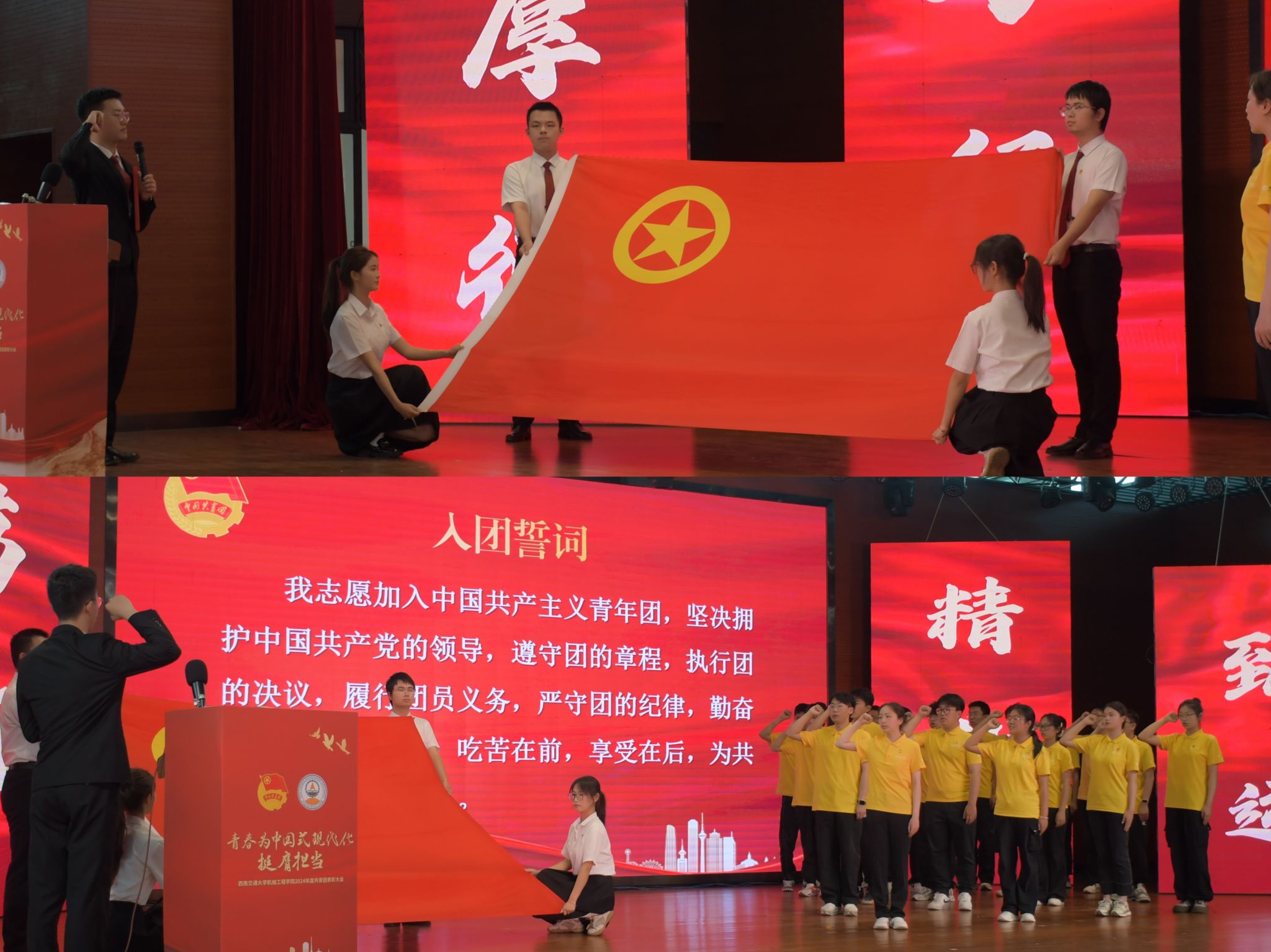 表彰大会上举行了新团员入团、老团员重温入团誓词仪式。团员青年代表朗诵了诗歌《青春薪火,机械有我》,演唱了歌曲《有我》。