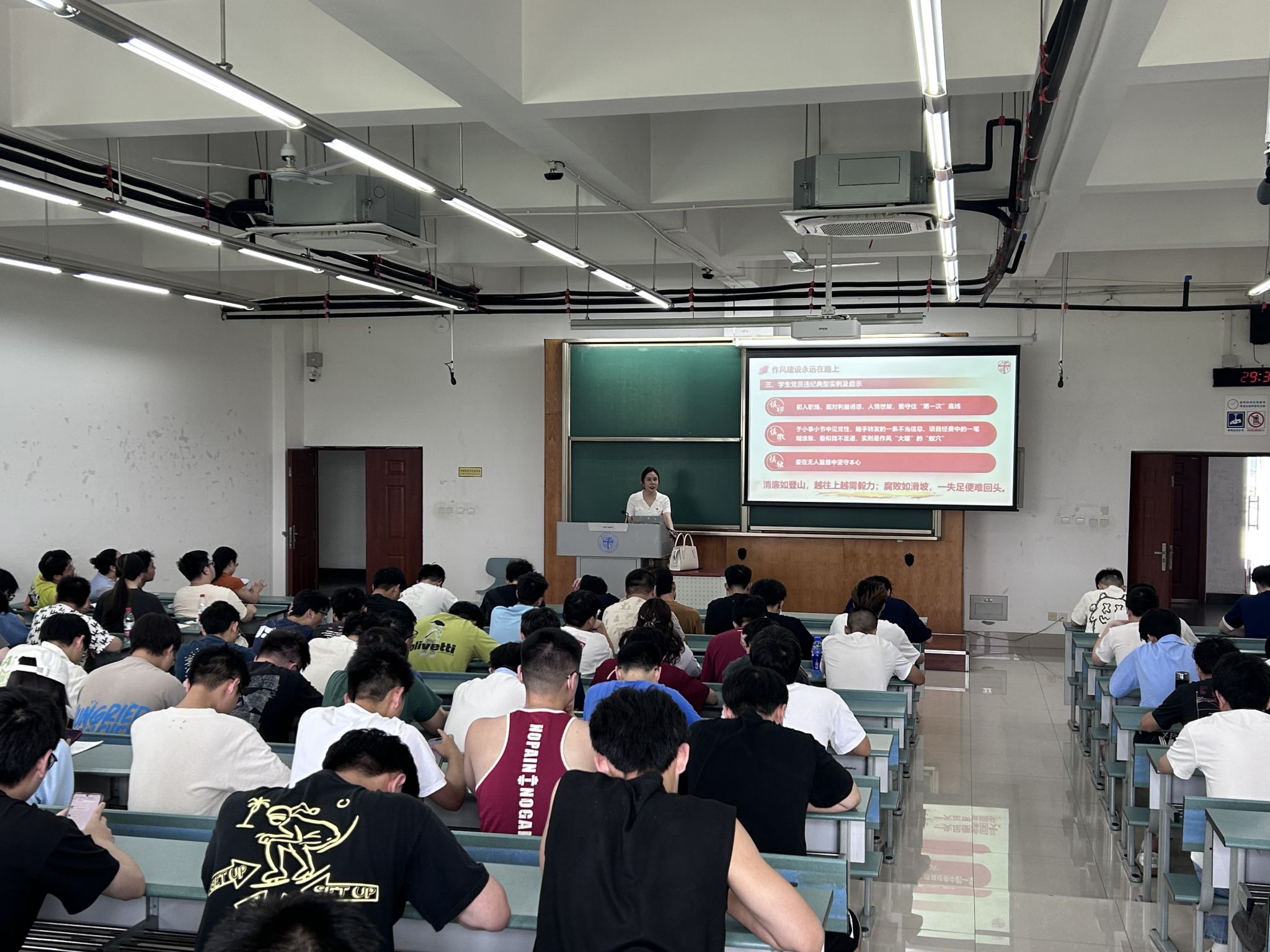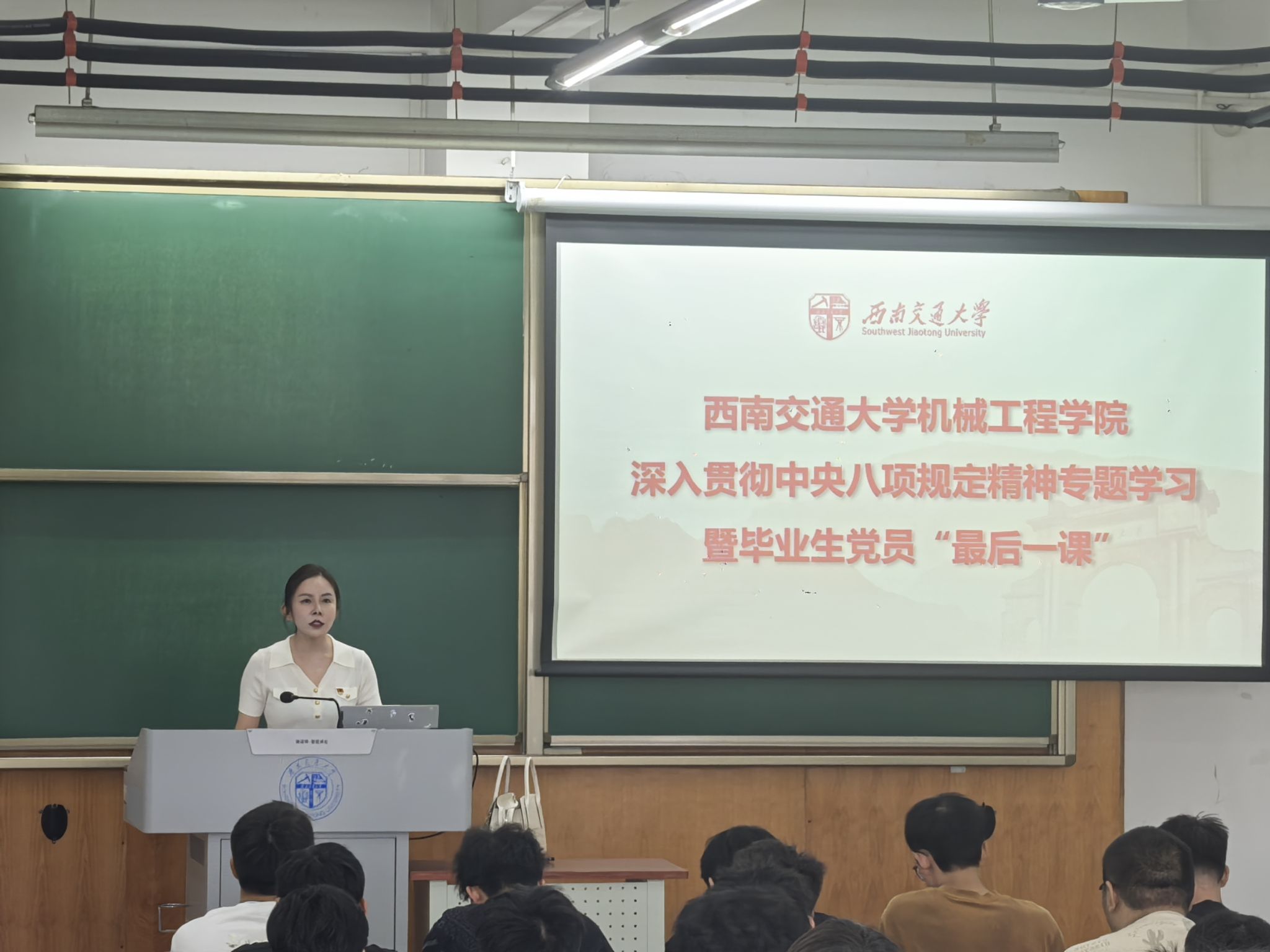 为引导毕业生党员坚定理想信念,筑牢廉洁从业思想根基,6月17日,球王会体育在犀浦校区四号教学楼举办深入贯彻中央八项规定精神学习教育专题党课暨毕业生党员“最后一课”。学院党委副书记沙晓雪担任主讲。