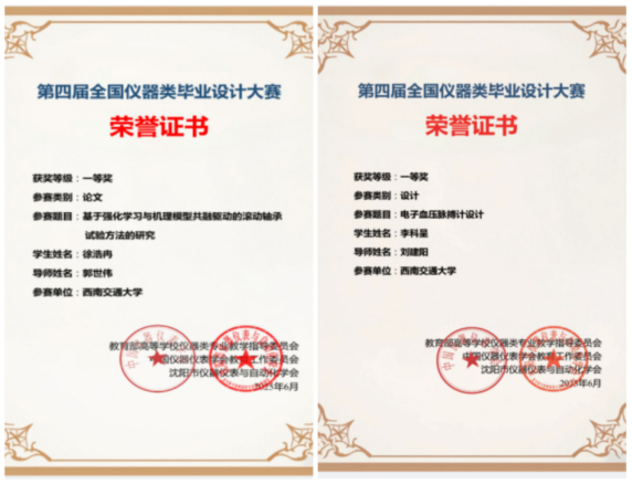 学院推选测控技术与仪器专业2021级2名学生参加此次大赛。经预赛、半决赛和决赛三个阶段激烈的汇总评比,刘建阳老师指导李科呈的毕业设计《电子血压脉搏计设计》、郭世伟老师指导徐浩冉的毕业设计《基于强化学习与机理模型共融驱动的滚动轴承试验方法的研究》均获得全国一等奖。