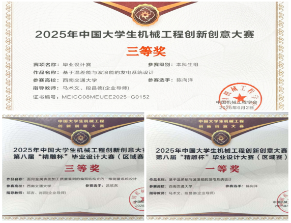 该大赛自2024年11月24日正式启动以来,共收到来自148所高校的1583项作品。经过评审,来自111所高校共计238项作品脱颖而出进入全国总决赛。今年学院首次组织师生参加,推荐2项毕业设计项目参与角逐,并取得好成绩。机械设计制造及其自动化专业2021级学生陈向阳在马术文老师指导下参赛的毕业设计《基于温差能与波浪能的发电系统设计》获全国三等奖、西部赛区区域赛一等奖,测控技术与仪器专业2021级学生吕欣然在邓吉老师指导下参赛的毕业设计《面向金属表面加工质量监测的偏振结构光的三维测量系统设计》获西部赛区区域赛三等奖。
