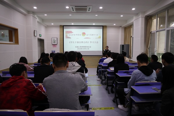 为了积极响应全国学联关于发起《自律公约》的倡议,及时规范学生干部的“官僚主义”行为,球王会官网球王会体育于2018年10月11日下午,在九里校区2217会议室召开《学生干部自律公约》学习大会。会议由辅导员王连富老师主持,辅导员唐序老师、王媛老师、崔山佳老师、管奇卉老师以及机械研会学生干部、18级各班班长参加了本次会议。