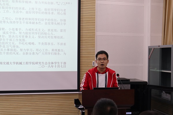 首先王连富老师发表讲话,王老师就网上曝光的某所高校社团成员因写错部长、主席名字而被要求抄写50遍这一事件,指出了学生干部中官僚气出现的危害性,他说:“学生干部不应该比学生高一级,而是应该比学生‘低一级’,因为学生干部是为同学们服务的。”同时王老师指出,我们学生干部应该做到信念坚定、作风正派、素质优良、德才兼备、纪律严明、作用突出,树立学生干部队伍的榜样作用,维护学生干部队伍的良好形象,更好地为学院发展贡献力量,更好地为同学们的学习生活服务。