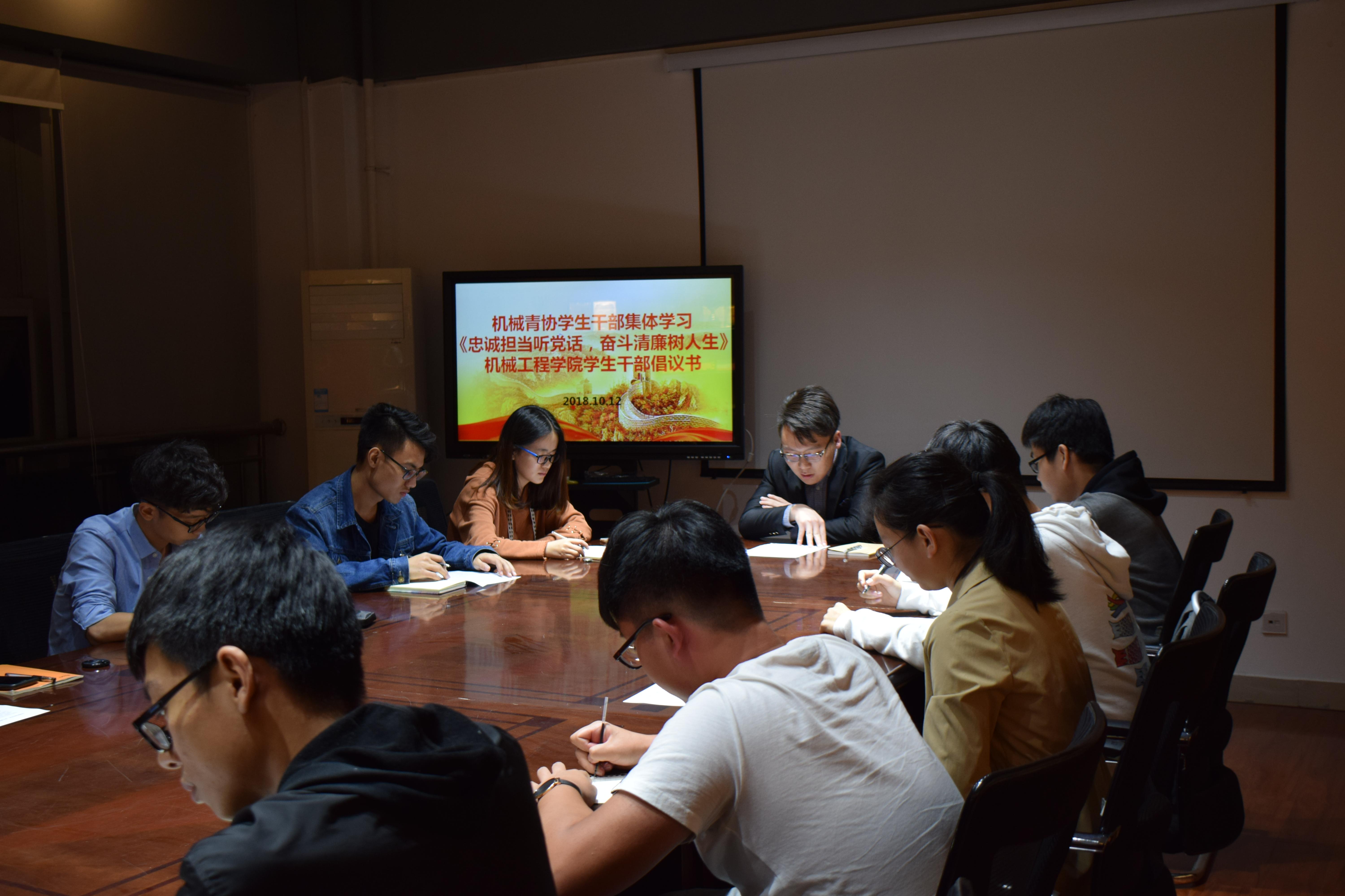 10月12日晚21:20球王会体育青年志愿者协会在X2201集体学习了《忠诚担当听党话,奋斗清廉树人生——球王会体育学生干部倡议书》。参与此次会议的有机械青协指导老师黄兆国,机械青协全体学生干部。本次学习会旨在端正学生干部的学习和工作态度,针对近期的某些高校学生组织官僚化的恶性事件进行自查,有则改之,无则加勉。