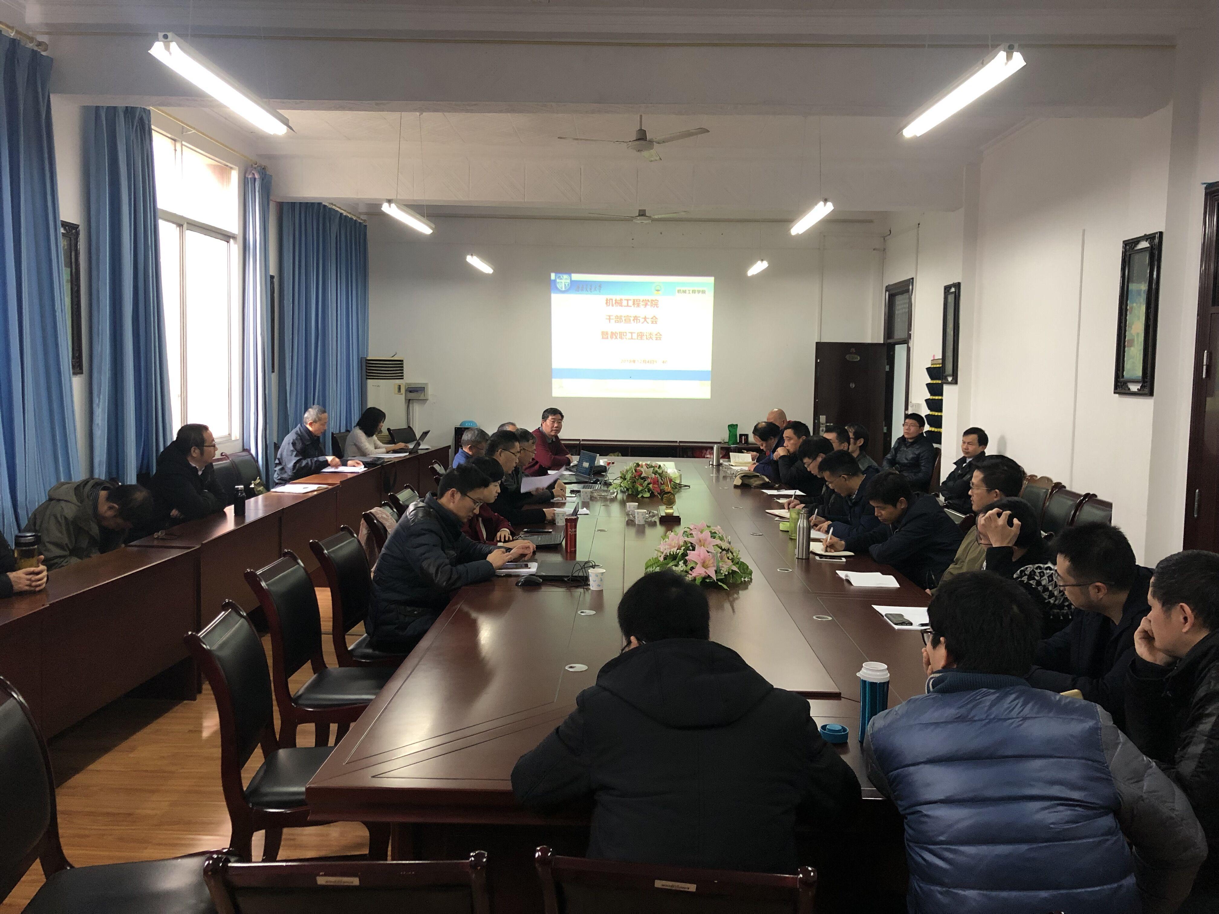 2018年12月4日,学院党委在峨眉校区交控系会议室召开交通设备与控制工程系干部宣布大会,学院全体党政班子成员、交控系班子成员、全体教职工参加了会议。会上宣读了交通设备与控制工程系系主任的任免通知: 经二○一八年十一月六日球王会体育党政联席会议研究决定,因工作岗位变动,免去程文明同志兼任的交通设备与控制工程系系主任;聘田怀文同志兼任交通设备与控制工程系系主任,聘期自2018年11月起至2022年10月止。经反复在峨眉交控系开展调研和民主测评,2018年11月6日党政联席会决定,交控系三级机构调整为机械基础教研室、轨道车辆教研室和工程机械与机电教研室,并完成了三级机构负责人的选聘。通过对峨眉交控系的机构和干部进行调整,为推动成峨一体化管理工作提供了组织保障。